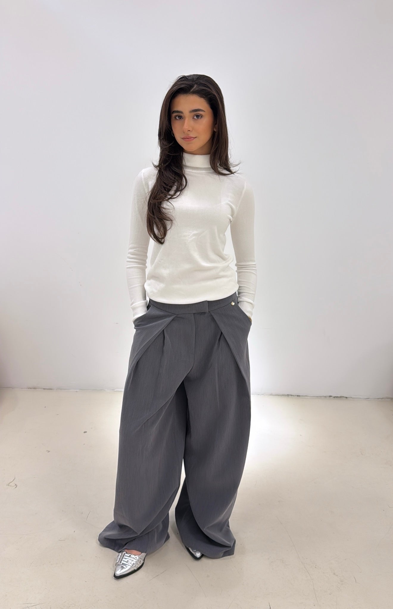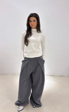 Deze wide leg pantalon is de perfecte mix van comfy en cool. De overslag aan de voorkant en de wijde pijpen geven de broek een opvallende, trendy look die meteen in het oog springt. De grijze kleur maakt ‘m makkelijk te combineren en zorgt ervoor dat elke outfit er moeiteloos stylish uitziet. Dit is zo’n broek waar je naar kijkt en meteen denkt die wil ik hebben.