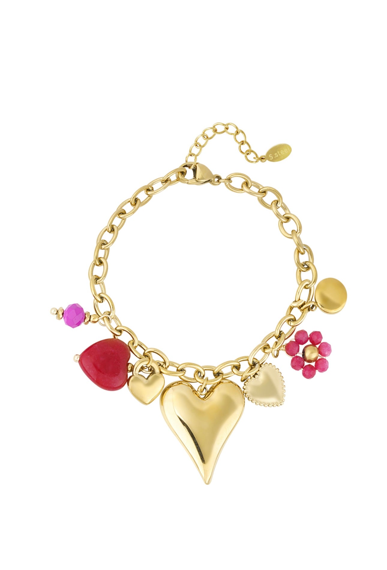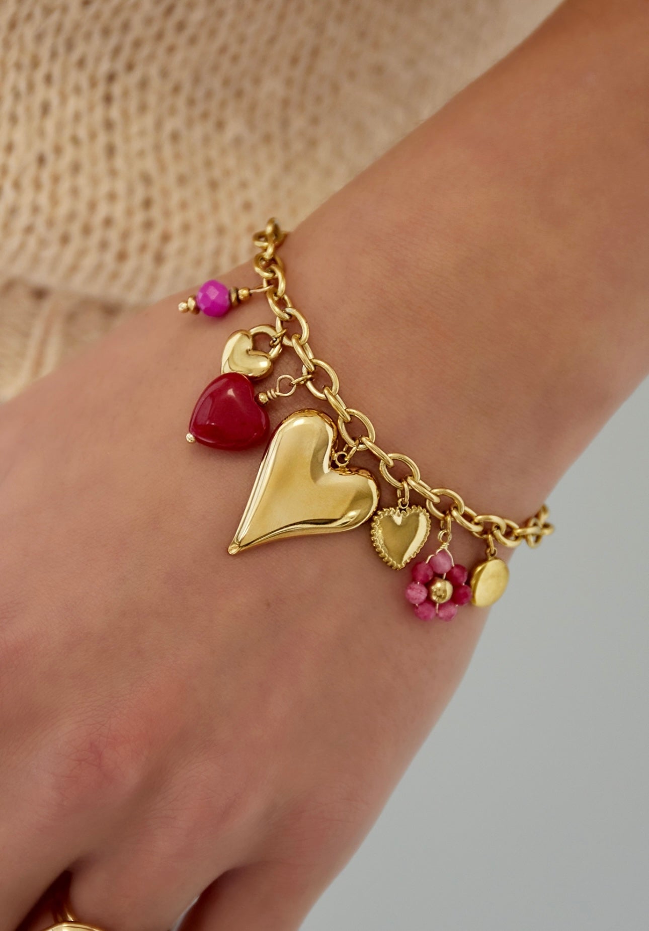 Speelse bedel armband met bedels en kralen. De armband is gemaakt van stainless steel en kralen in de kleur roze/ rood