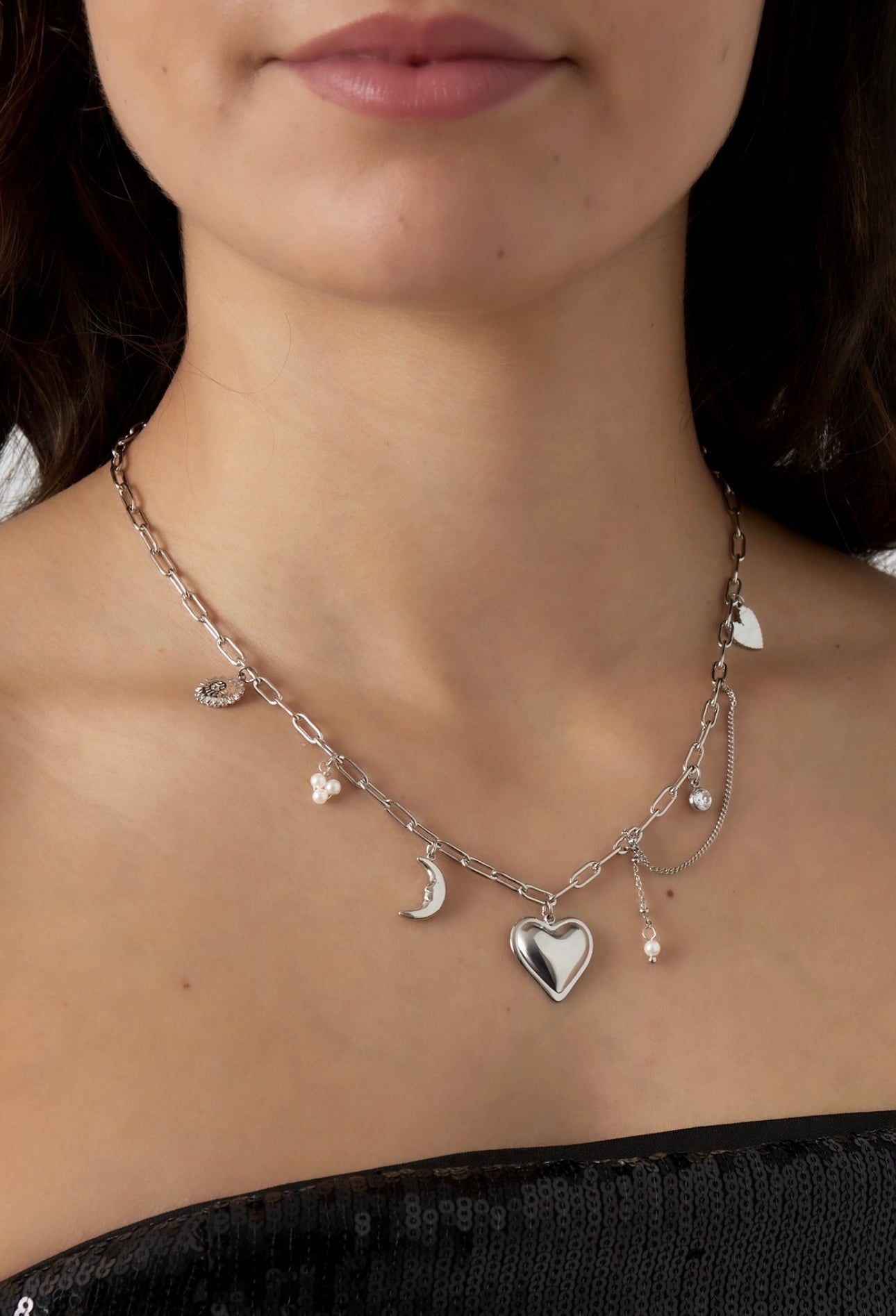 Sierlijke ketting met verschillende bedels in de kleur zilver. De ketting is gemaakt van stainless steel en is ook verkrijgbaar in de kleur goud.