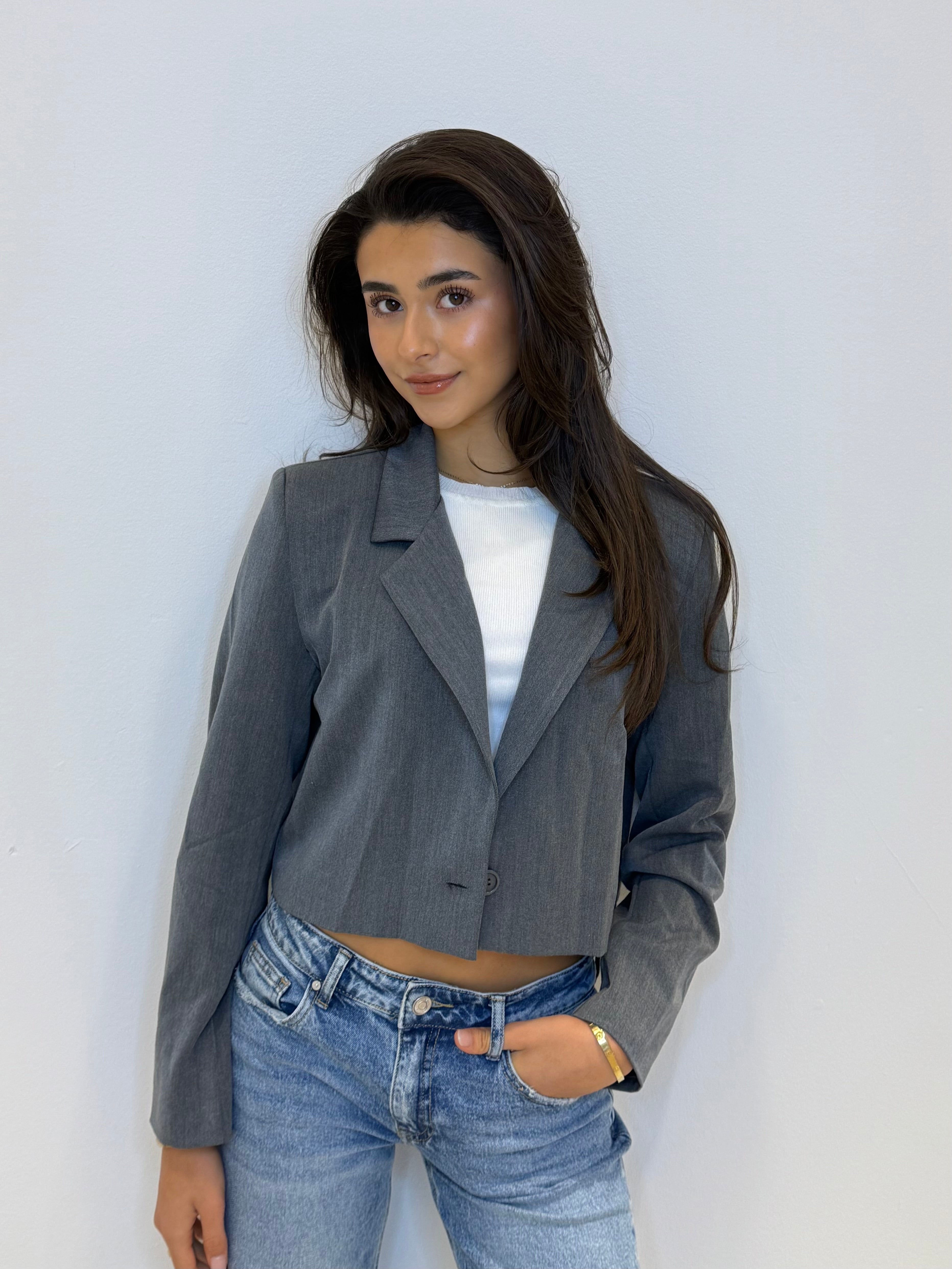 Een echte musthave blazer in grijs met een trendy cropped fit die elke outfit een effortless Parisian chic look geeft. Naast zwart en camel is grijs de ultieme kleur die niet mag ontbreken in jouw garderobe.