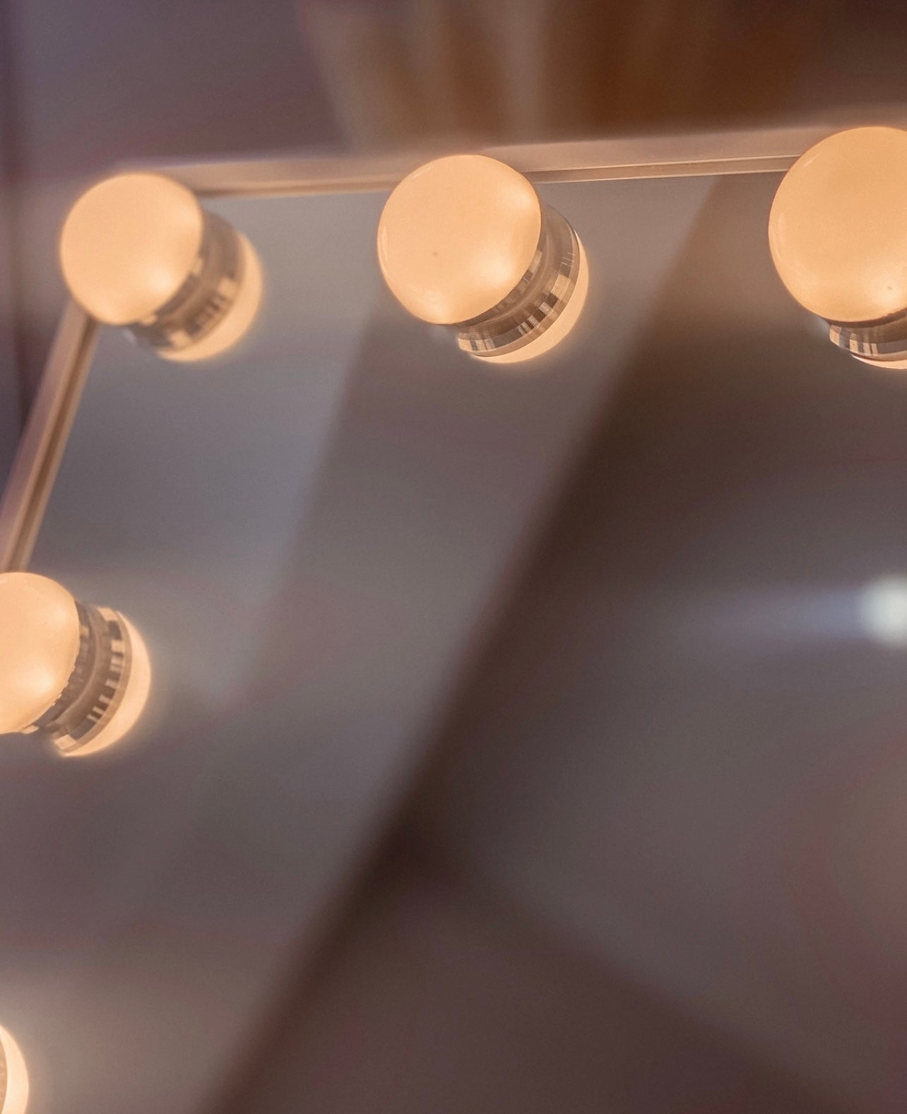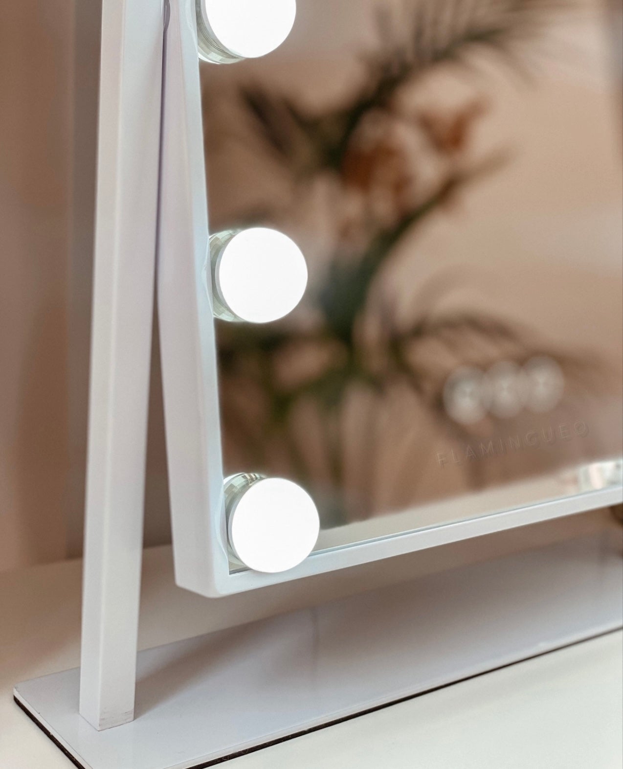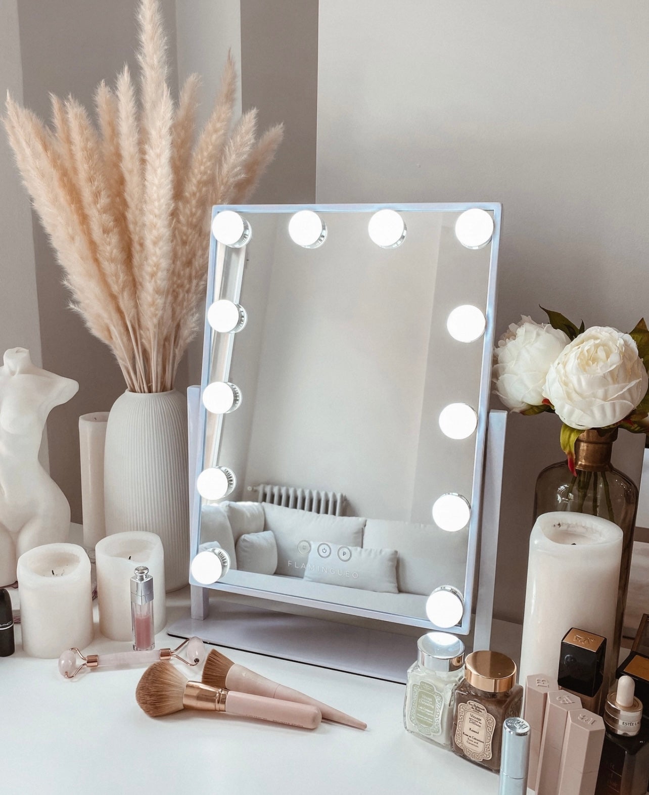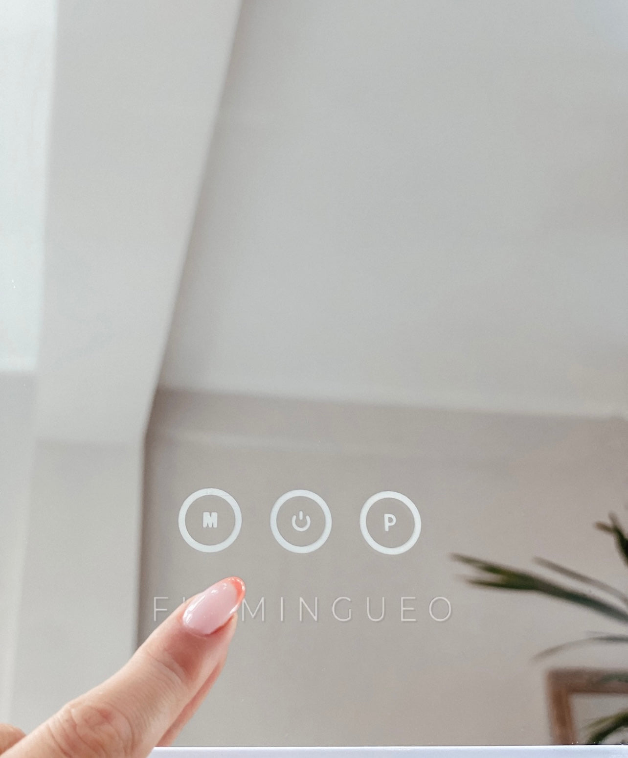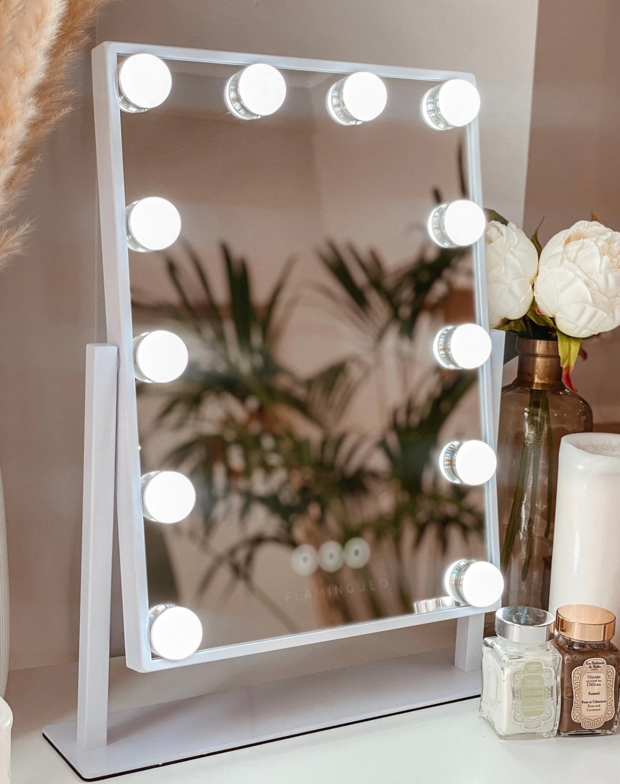 The mirror has 12 LED lights with 3 light modes. The intensity of the light is adjustable with the touch buttons.
