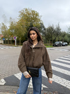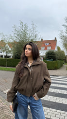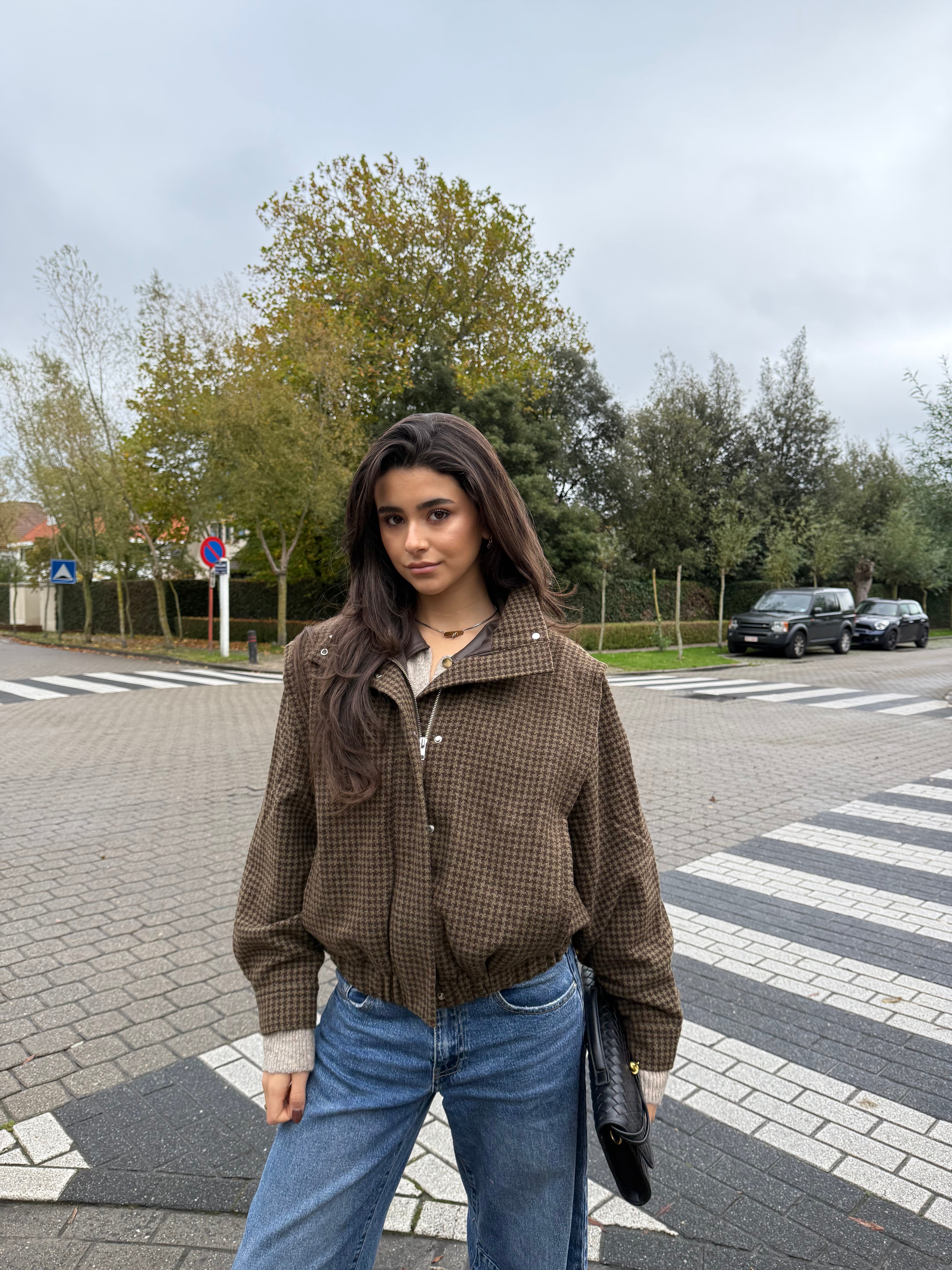 Ontmoet jouw nieuwe favoriete herfst essential. Deze prachtige jasje in chocoladebruine pied-de-poule is het perfecte balans tussen stijl en comfort. De relaxed fit, zachte textuur en subtiele structuur geven een elegante, effortless look. Draag ‘m casual met jeans of classy met een mooie pantalon  dit item tilt elke outfit moeiteloos naar een hoger niveau. Wat ook een leuk is dat de mouwen er af geritst kunnen worden, zo heb je niet alleen een jas maar ook leuk als bodywarmer.