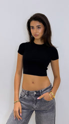 The Lynn top in black is your new go-to essential. Minimalist and timeless, yet with a modern cropped fit that adds an edgy touch to any outfit. Pair it with a jacket or wear it solo with jeans for effortless style.