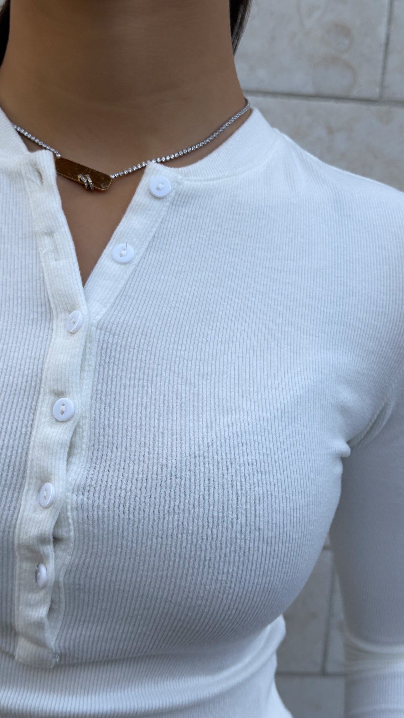 This white button-up top is the perfect basic, versatile piece. The fabric is super soft and feels wonderfully comfortable, making it perfect for everyday wear. Wear it casually with jeans or create a classy look with trousers. A timeless wardrobe essential.