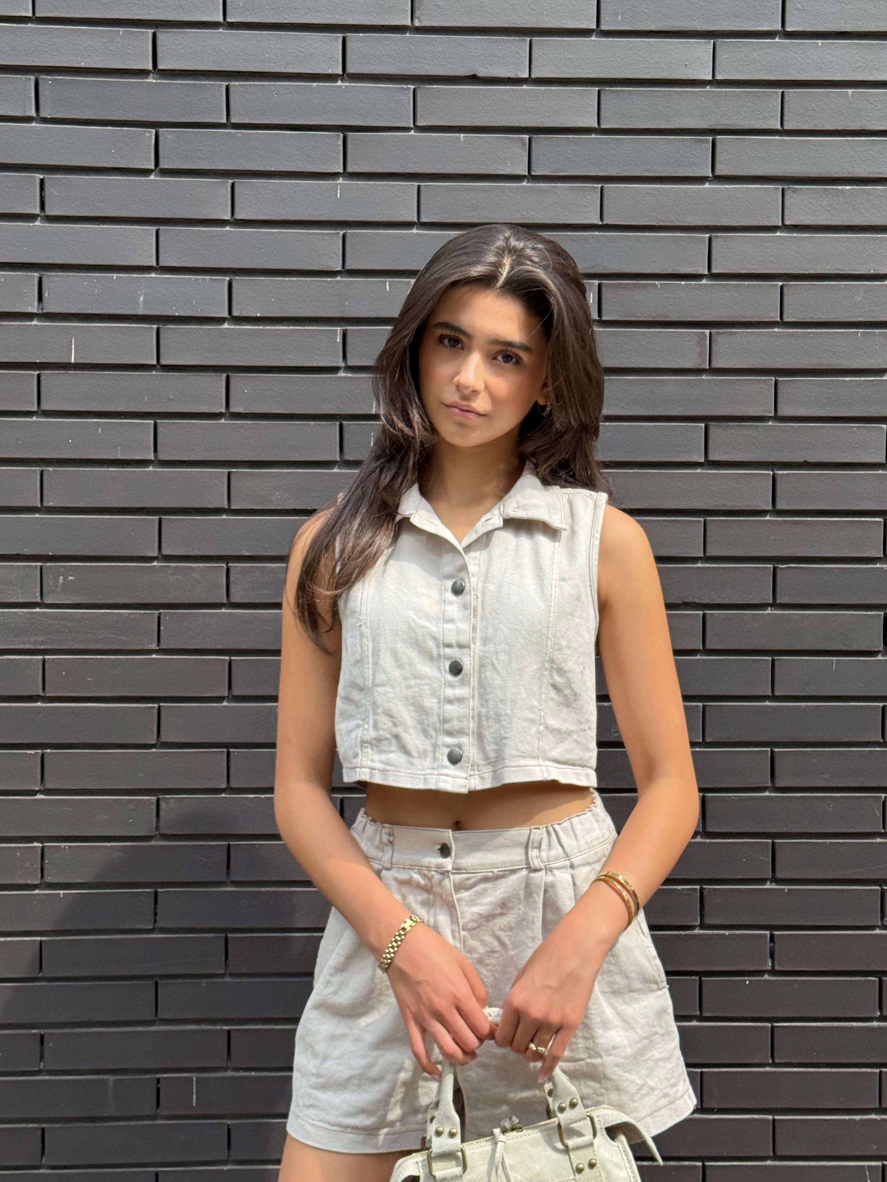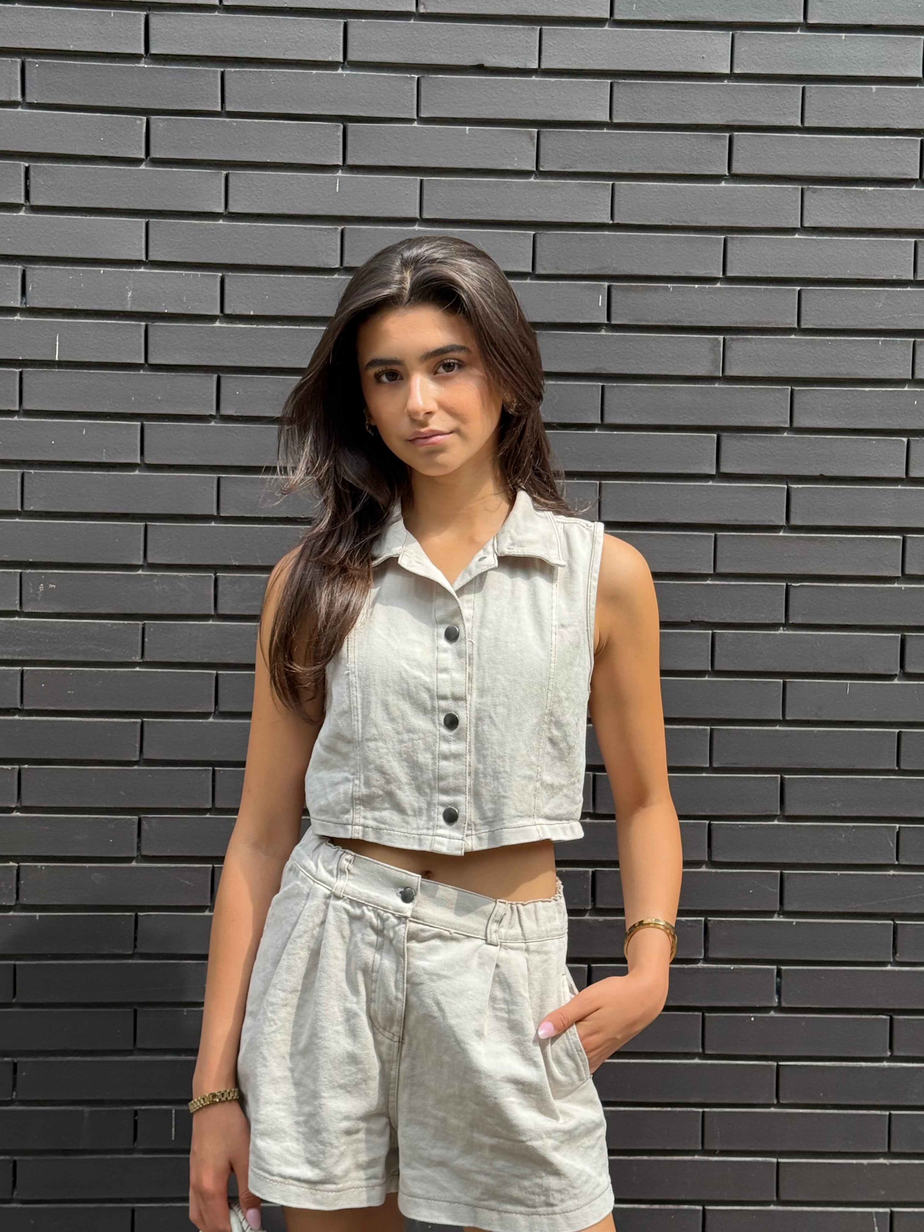 Minimalist yet incredibly stylish, this ecru denim set is the perfect outfit for a trendy, effortless summer look. The cropped button-up top and matching mid-waist shorts are crafted from soft denim with a vintage feel.