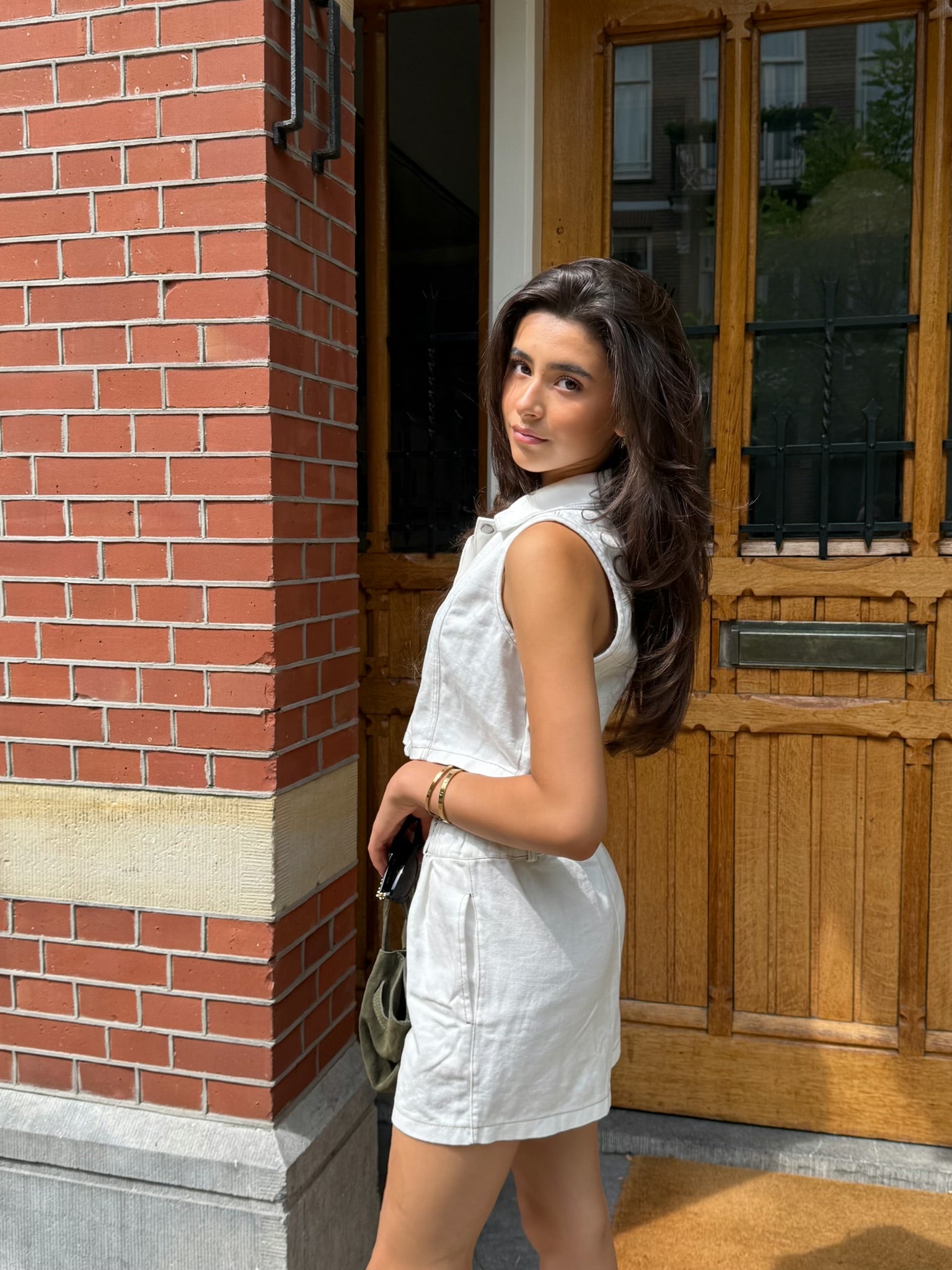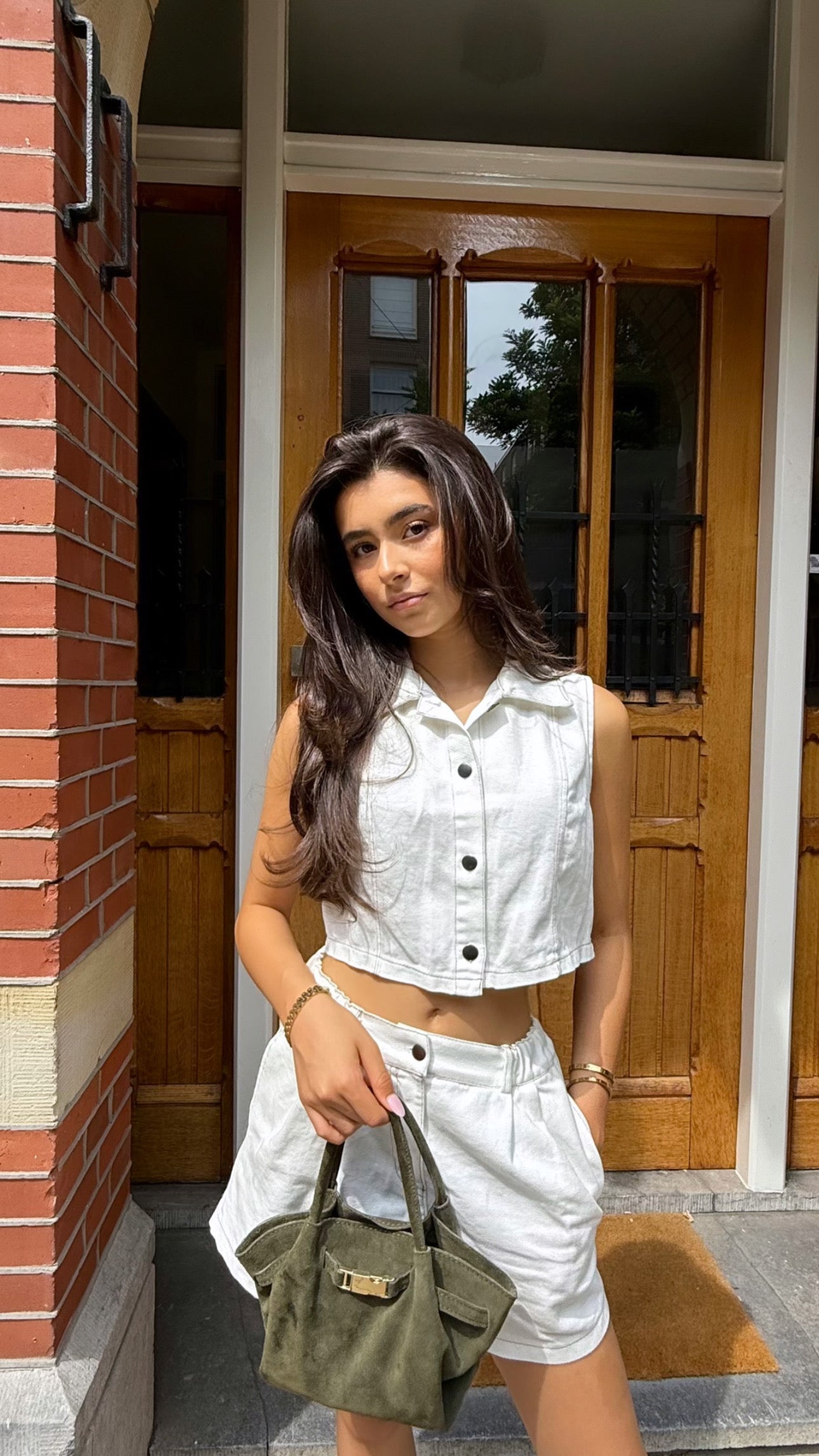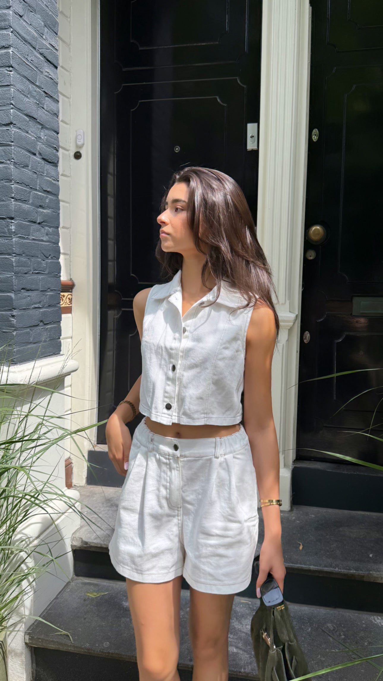 Minimalist yet incredibly stylish, this off-white denim set is the perfect outfit for a trendy, effortless summer look. The cropped button-up top and matching mid-waist shorts are crafted from soft denim with a vintage feel.