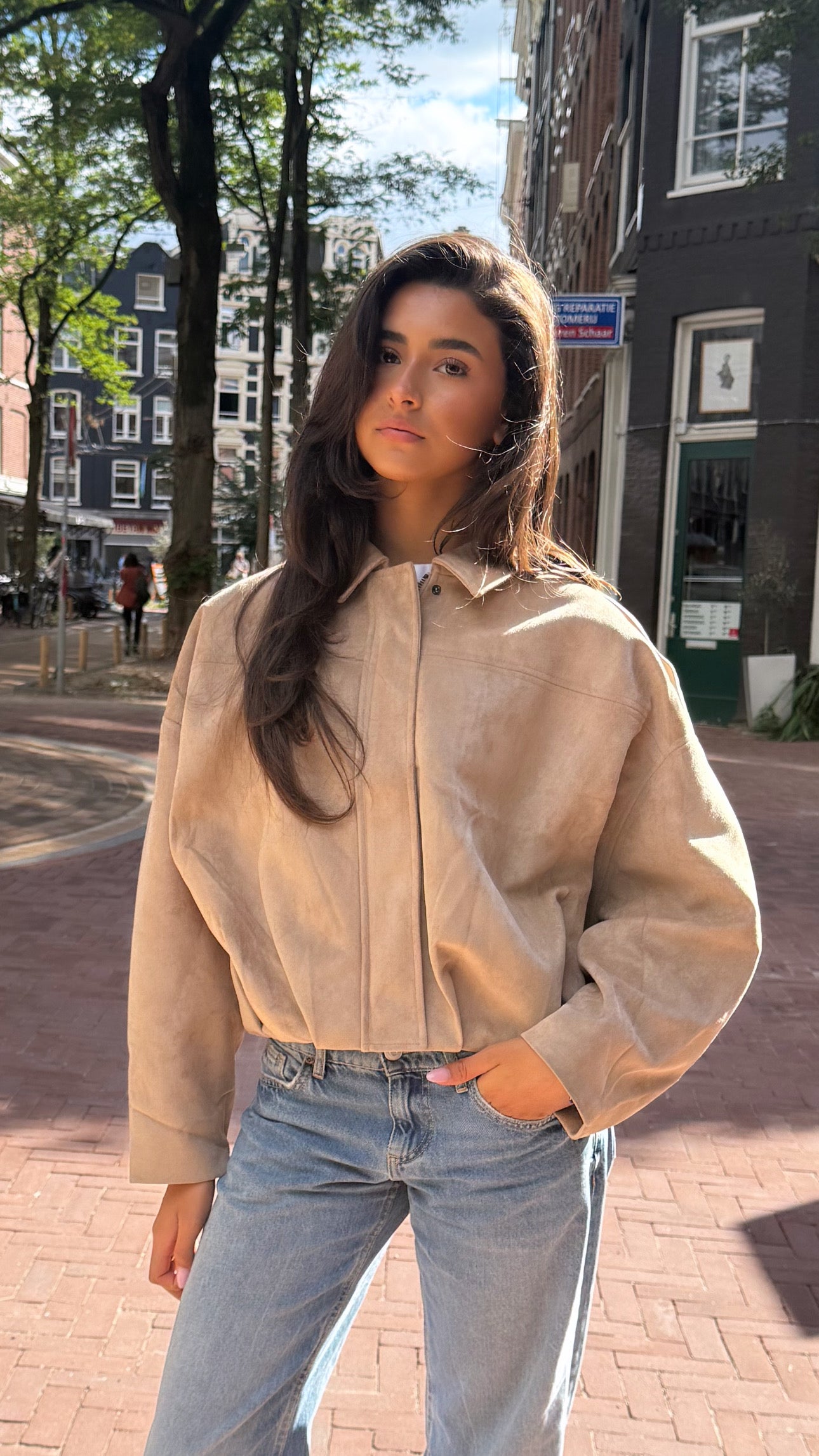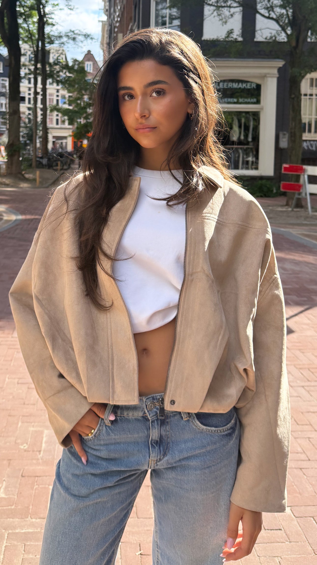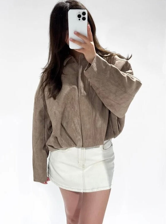 Discover the bomber jacket that's going viral everywhere this season. The Milly and Car Viral bomber jacket has an oversized fit and a soft suede look that adds a luxurious and effortless touch to any outfit. Available in taupe and beige, two timeless shades that easily pair with both cool jeans and a stylish skirt. Comfortable, trendy, and a wardrobe essential.