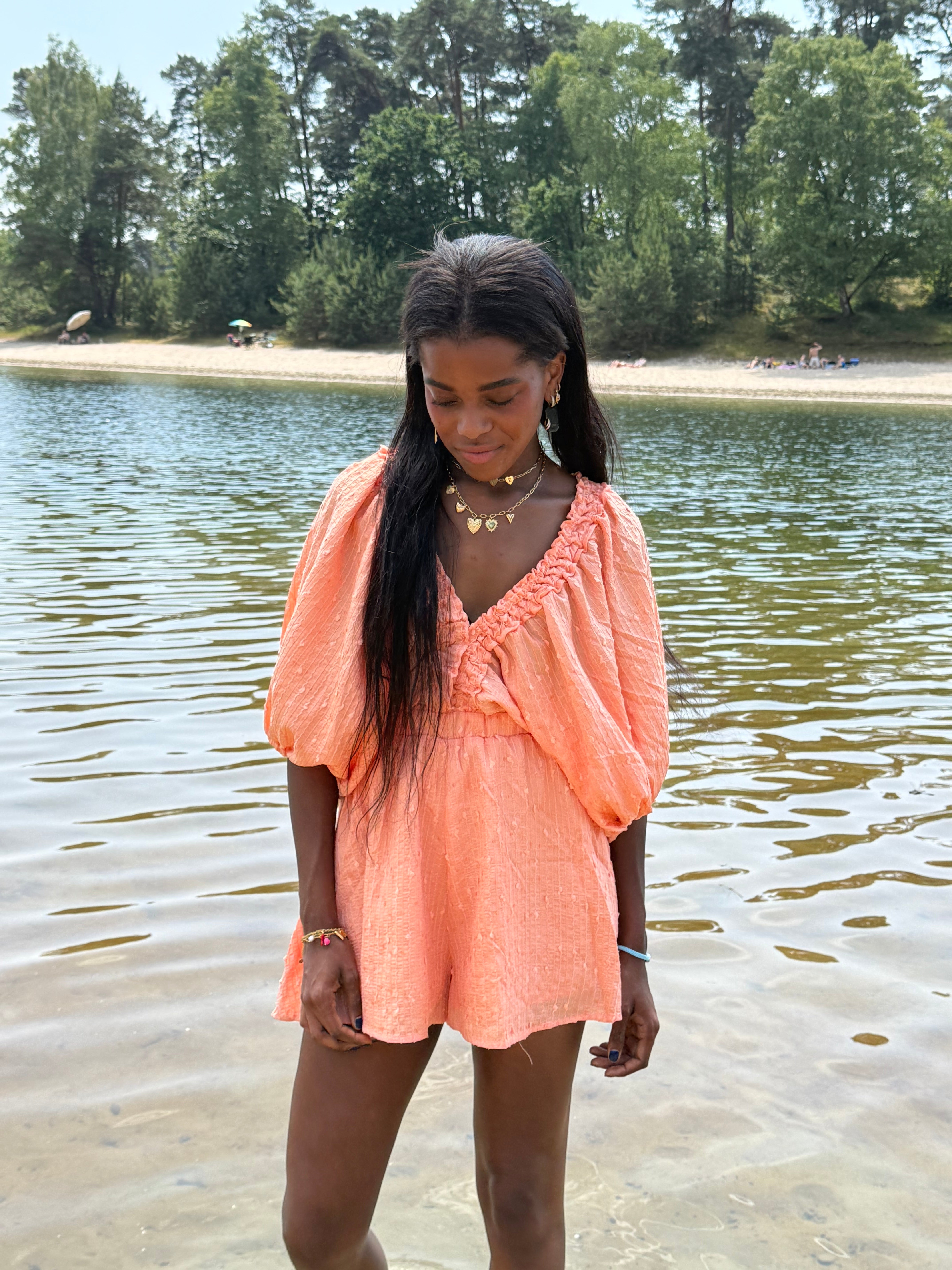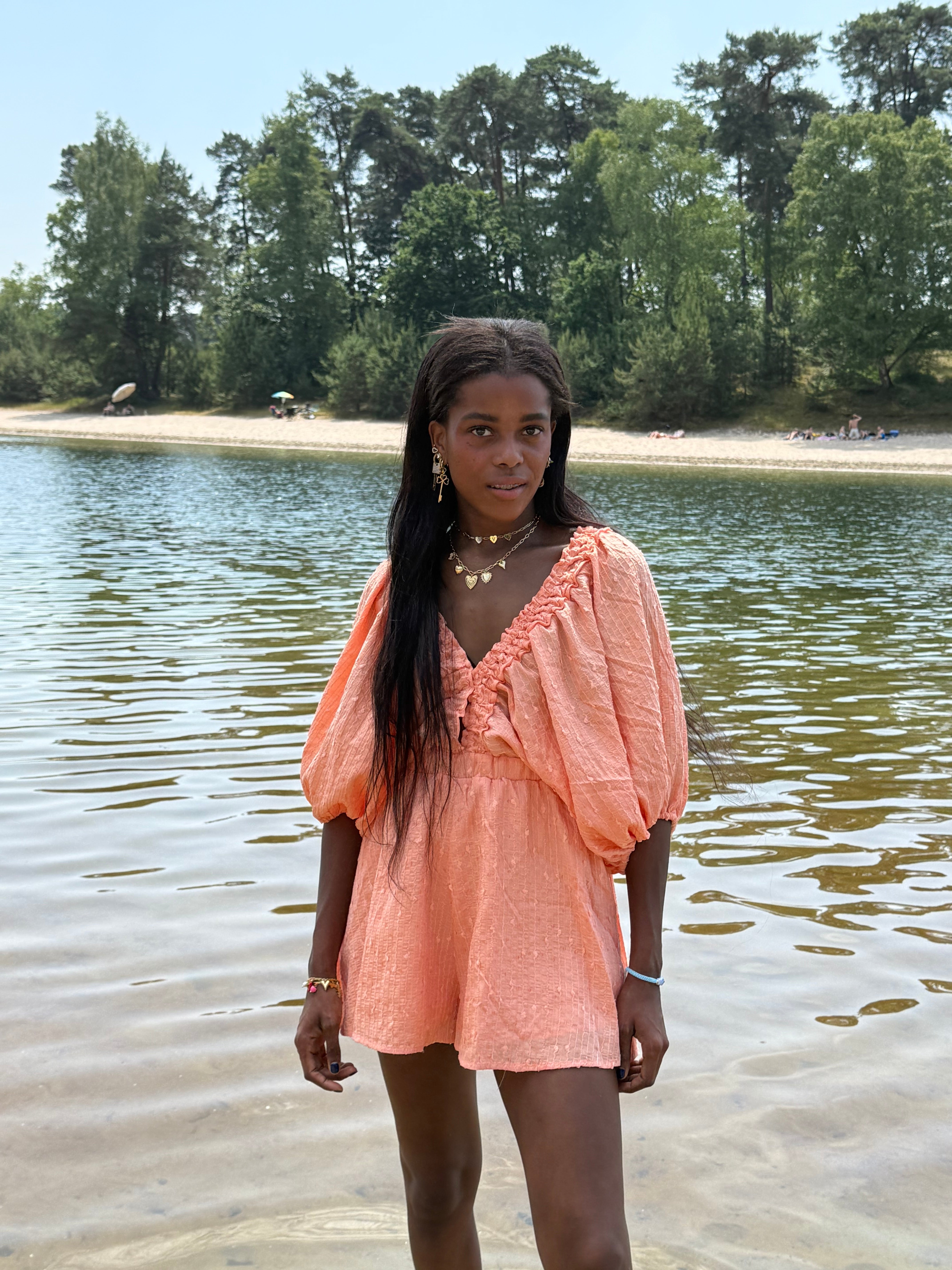 This airy peach jumpsuit is everything you need on a sunny day. The soft, breathable fabric drapes effortlessly, and the relaxed fit ensures ultimate comfort. The elegant puff sleeves and subtle ruffles along the neckline give this jumpsuit a playful and feminine touch.