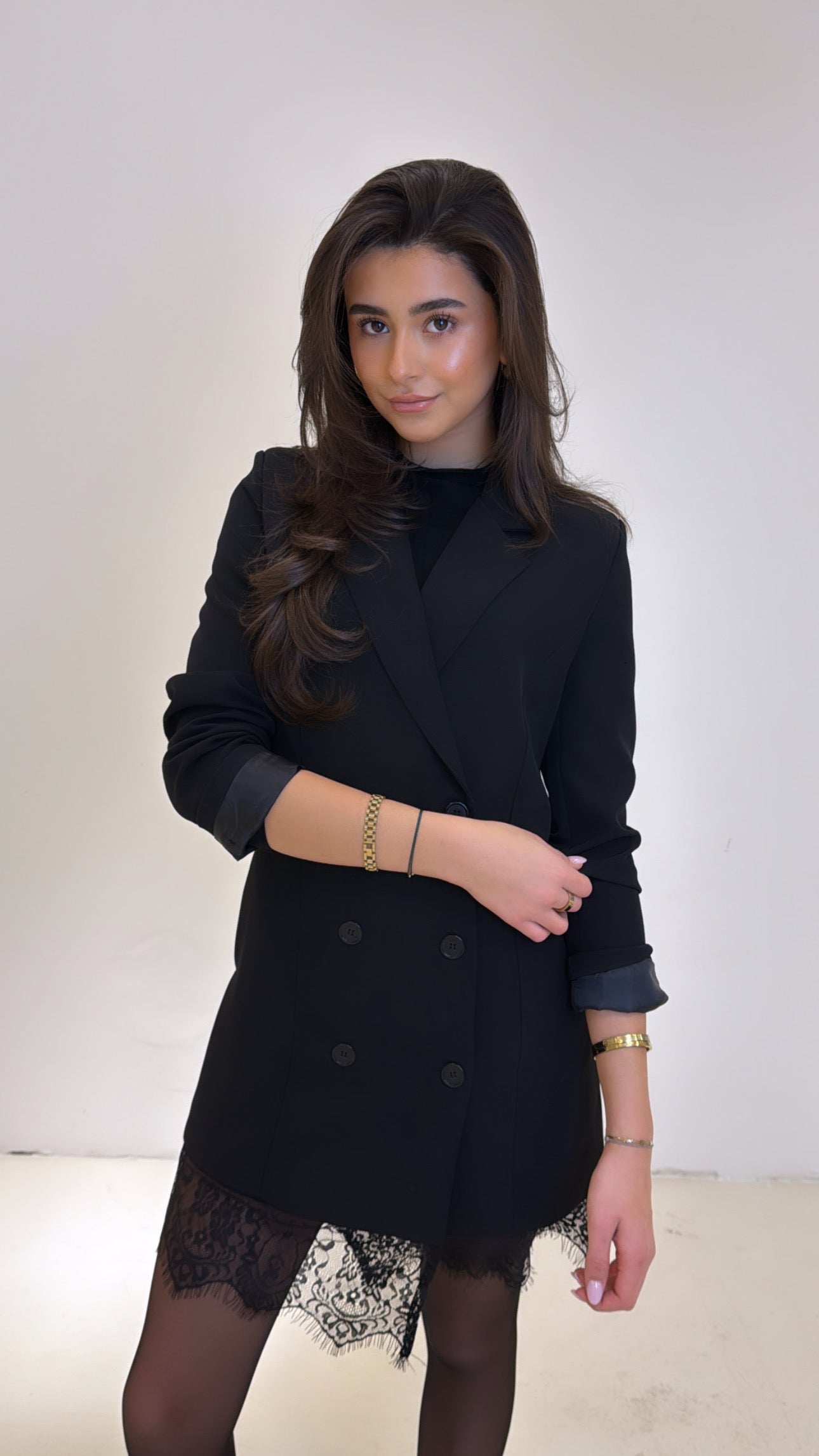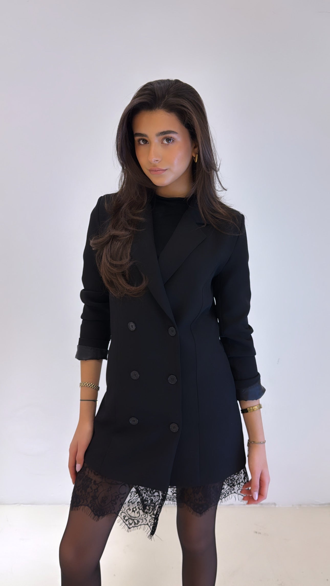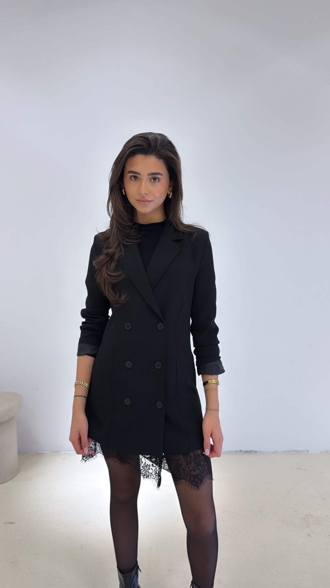 Deze blazer dress uit onze party collectie is de perfecte mix van classy en cool. de double-breasted fit geeft je een powerful look, terwijl het kanten detail aan de onderzijde zorgt voor een speelse, sexy vibe. combineer met boots of heels en jij bent helemaal klaar voor je next night out.