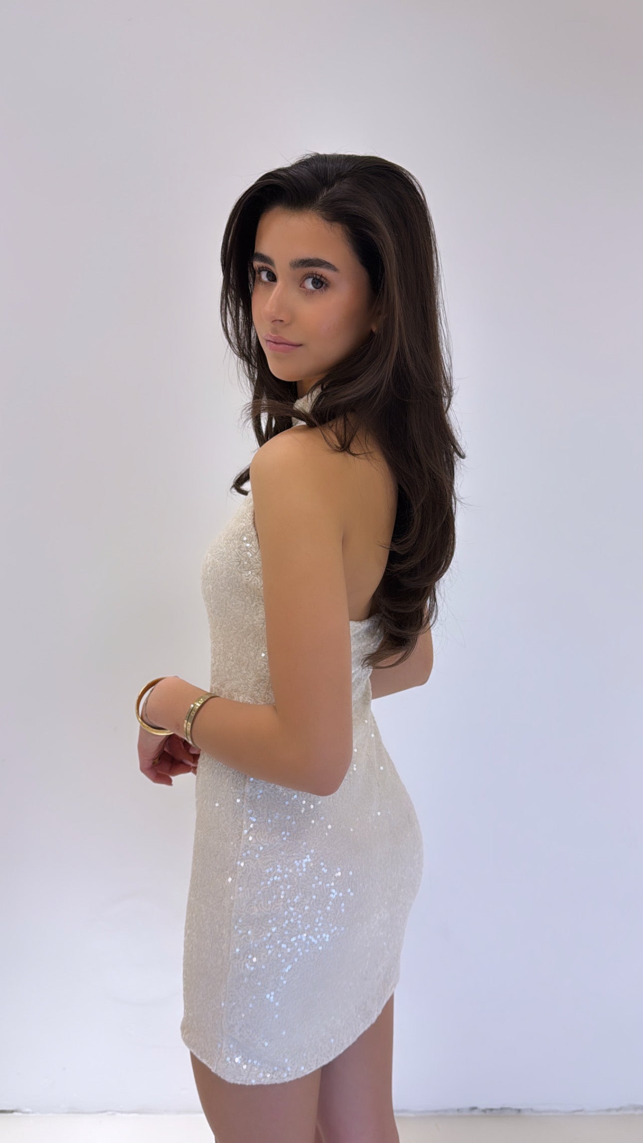 Deze sparkle halter dress is dé showstopper van het party season. De jurk wordt in de nek bevestigd, valt superkort en heeft een open rug voor die extra wow factor. De all-over sparkles maken elke beweging magisch. Perfect voor iedereen die houdt van shine, glam en een tikkie bold.