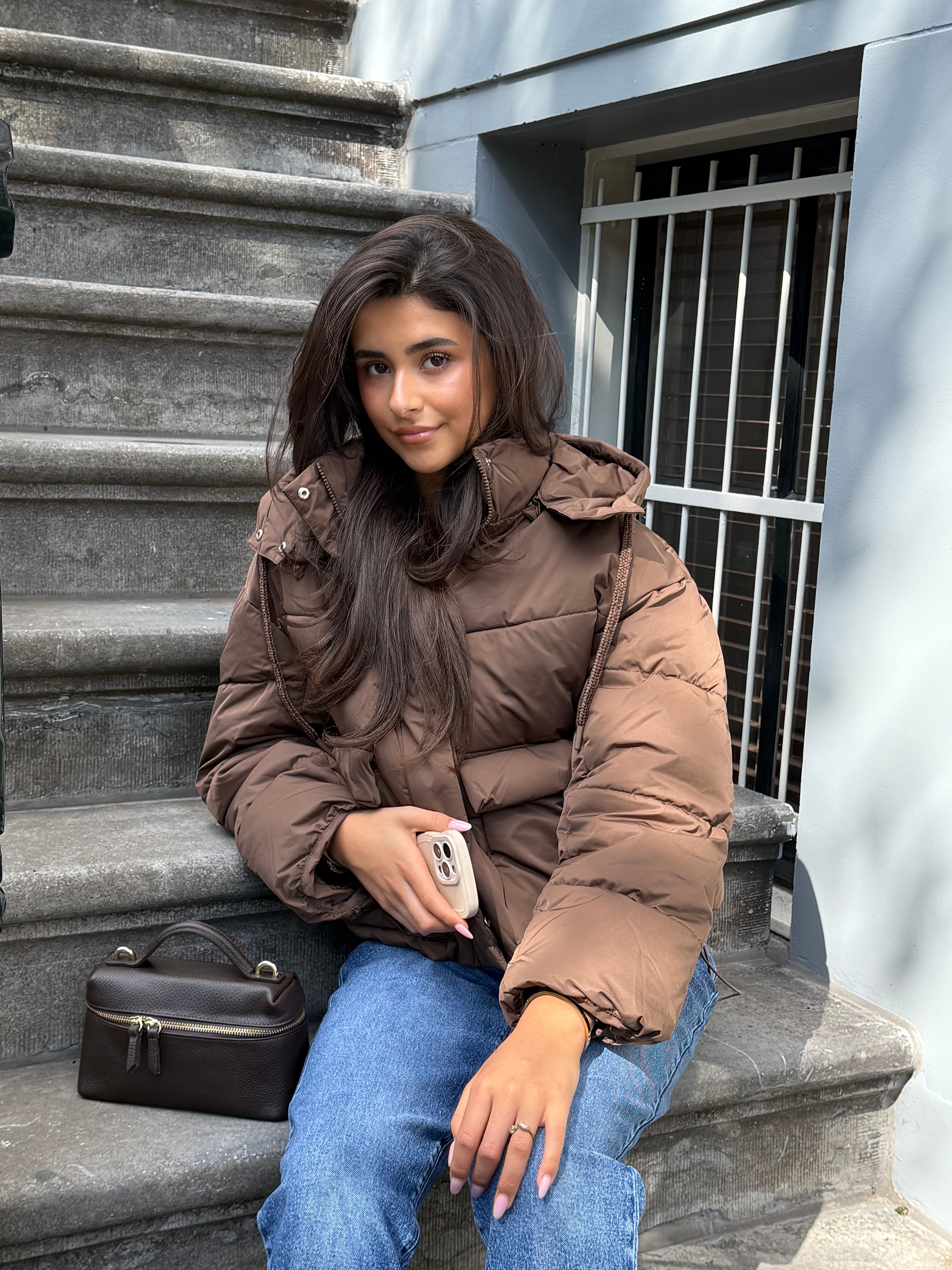 Discover the chocolate brown puffer jacket from our fall collection Paris. A warm jacket in a deep chocolate brown color with a comfortable fit. The light padding and soft fabric make this an ideal jacket for cold days, while the color provides a luxurious look. Combine it with denim for a casual city look or wear it over a dress for a modern fall outfit.