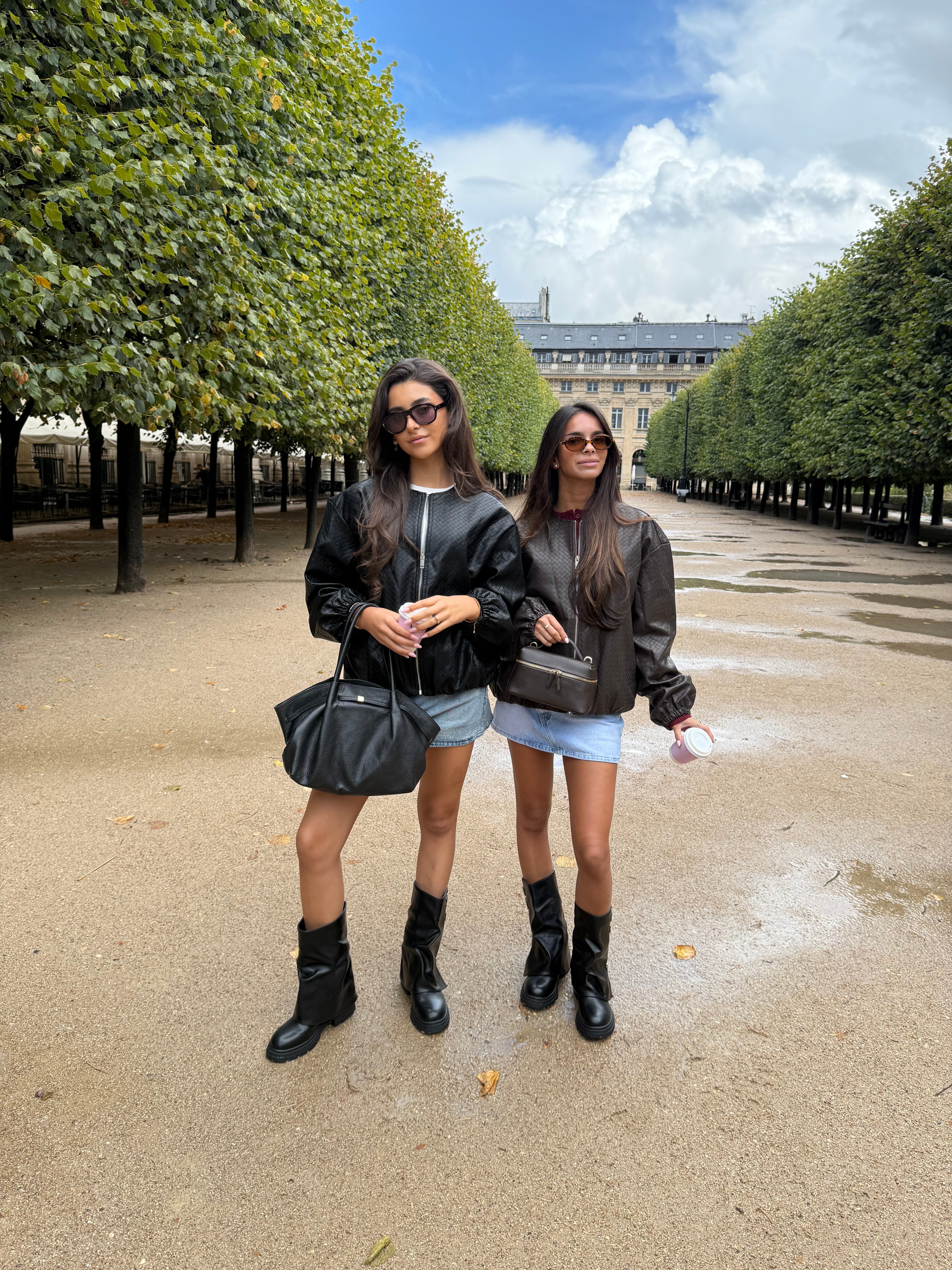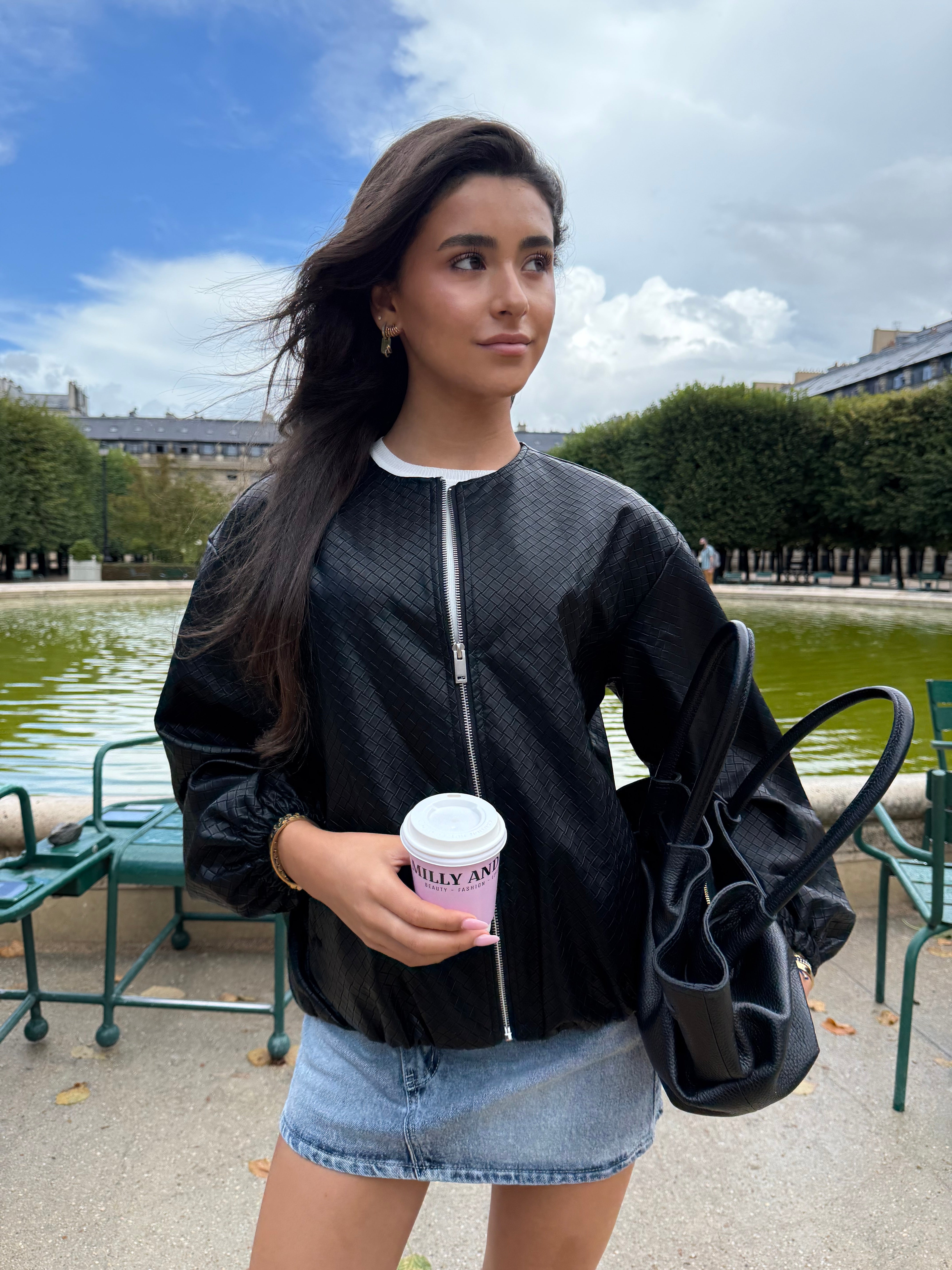 The black leather bomber jacket from our fall Paris collection is a modern and versatile piece. The oversized fit and timeless black color make this bomber easy to pair with any outfit. Wear it casually with jeans or over a dress for an edgy yet elegant look.