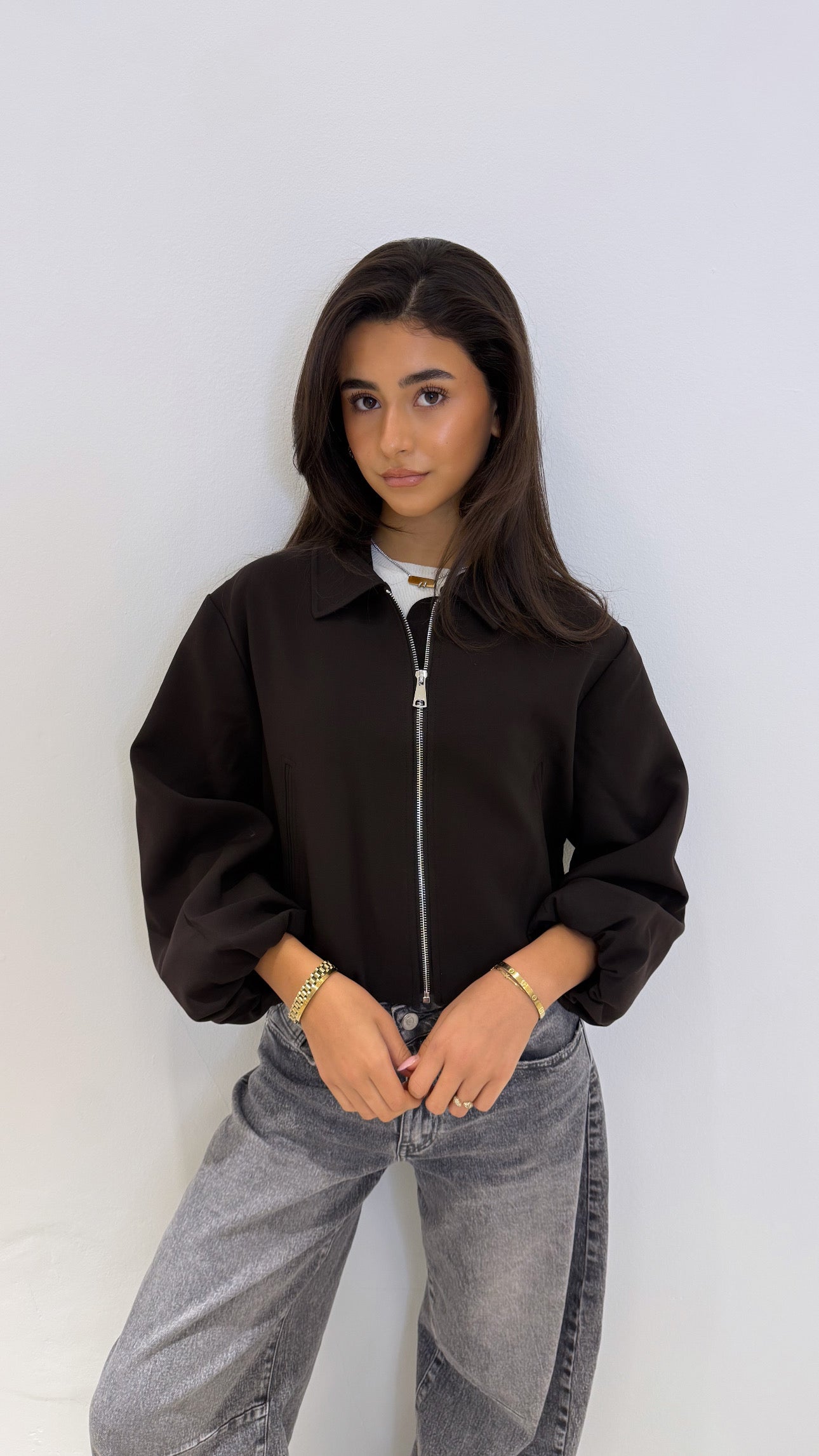 The Liva jacket is a true must-have for this season. With its subtle balloon sleeves and cropped fit, this cardigan instantly gives your look a trendy upgrade. The dark brown color makes it super easy to style, while the zipper and soft fabric ensure ultimate comfort. Whether worn open or closed, it pairs beautifully with a basic top from the Milly and Car collection.