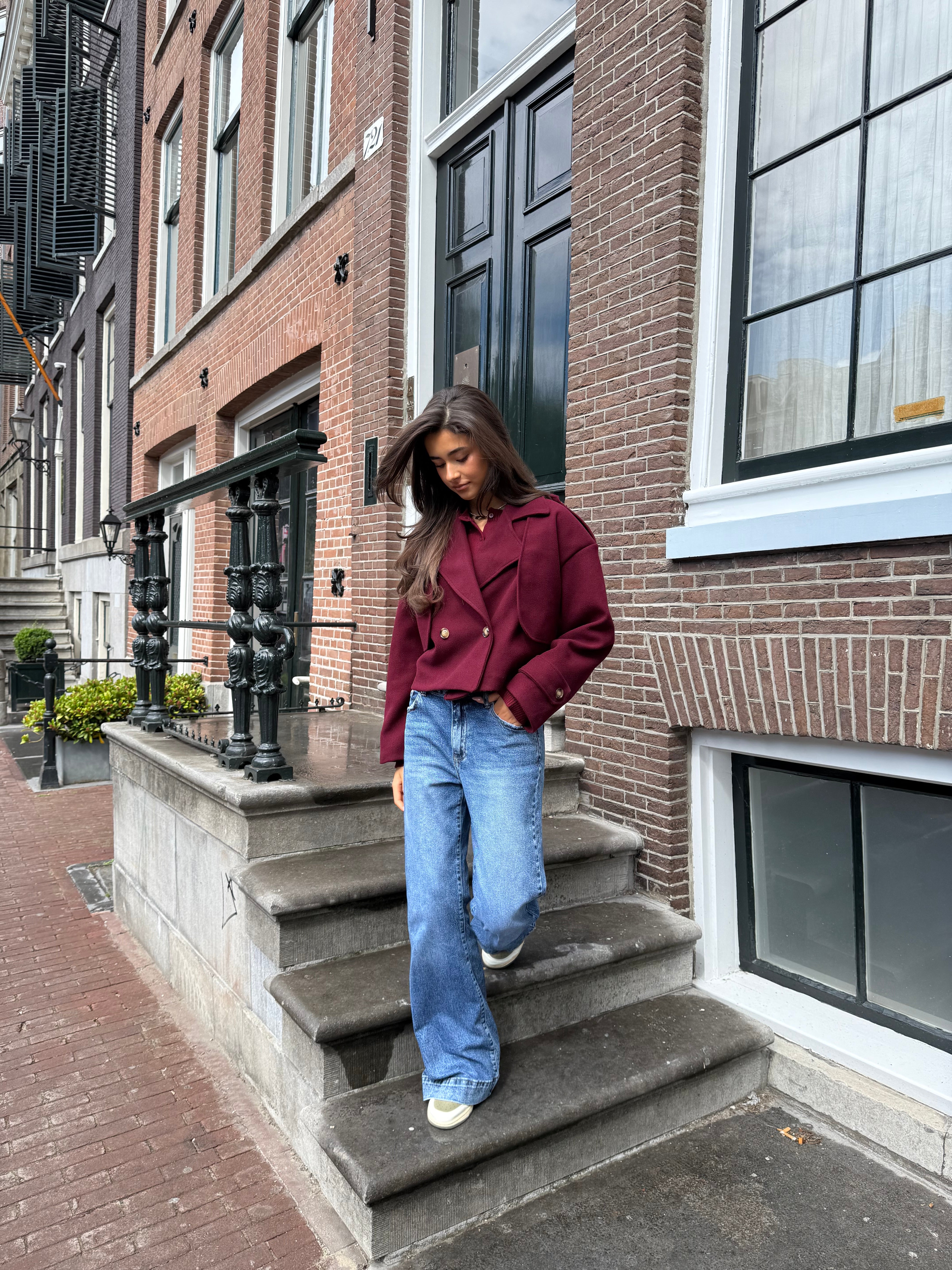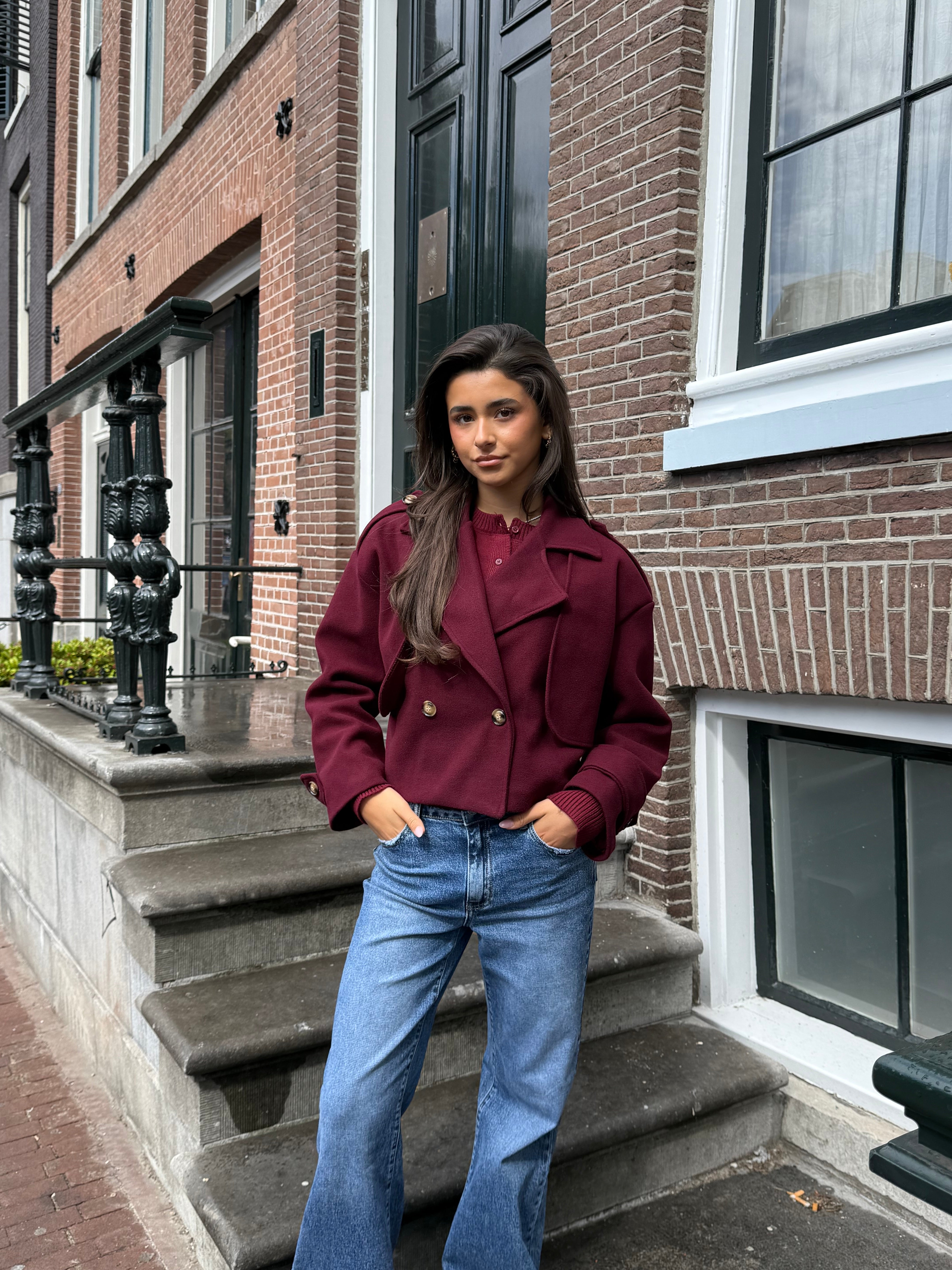 The Paris Bordeaux trench coat from our fall Paris collection is a soft and warm coat with an elegant cropped fit. The deep burgundy hue adds a chic touch to any outfit, making this trench a true must-have for the new season.