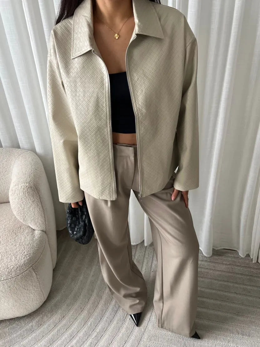 Een tijdloze essential in een elegante ecru tint. Deze fake leren jas heeft dezelfde luxueuze structuur en moderne fit als de dark mocha-variant, maar met een lichtere, verfijnde uitstraling. Draag ‘m ton-sur-ton met de bijpassende broek voor een minimalistische, high-end look.