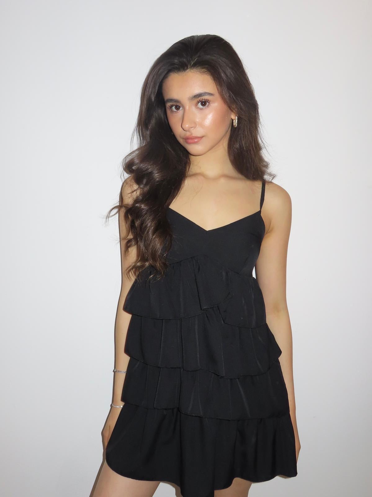 Beautiful Mabel dress in black. The dress has multiple layers, creating a playful look. It's perfect for a dinner party or summer party.