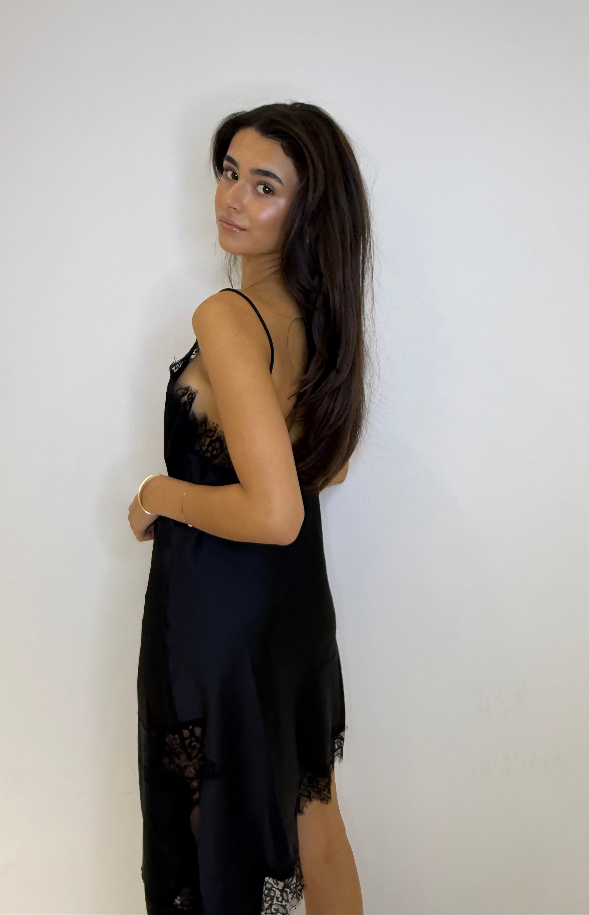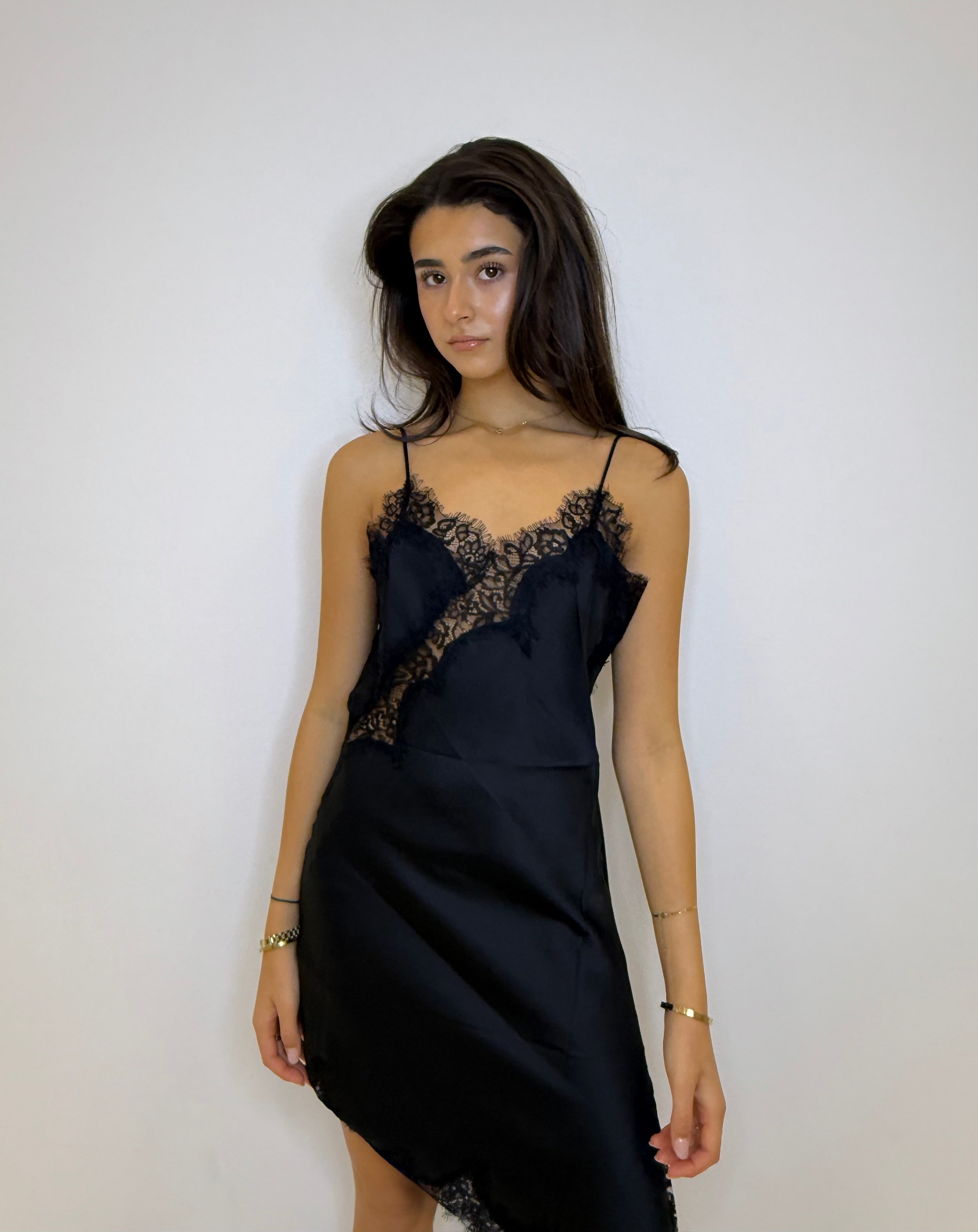 De silky lace dress is een prachtige jurk met een losse fit, elegante kanten details en een schuin lopend design. De silky stof valt soepel en geeft de jurk een luxe uitstraling. Perfect voor een diner of een night out waarbij je effortless chic wilt verschijnen.