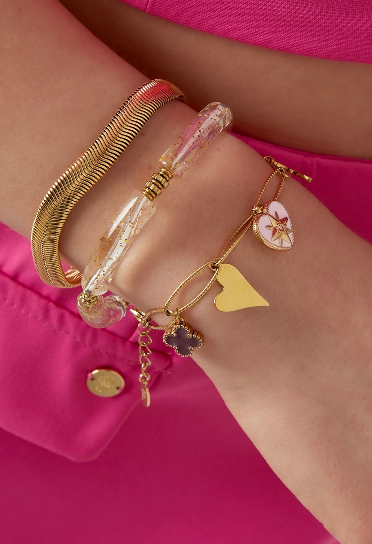 How cute is this fun and playful bracelet with charms of hearts, butterflies and clover flowers.