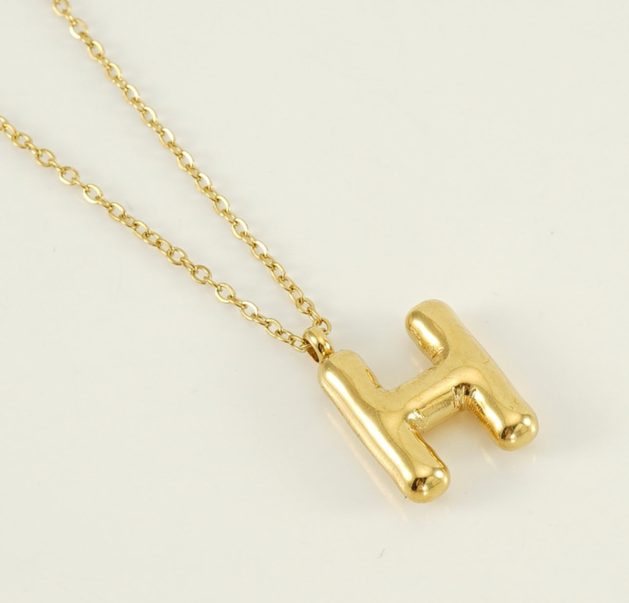 Bubble letter necklace in gold color. The necklaces are available in all letters of the alphabet.