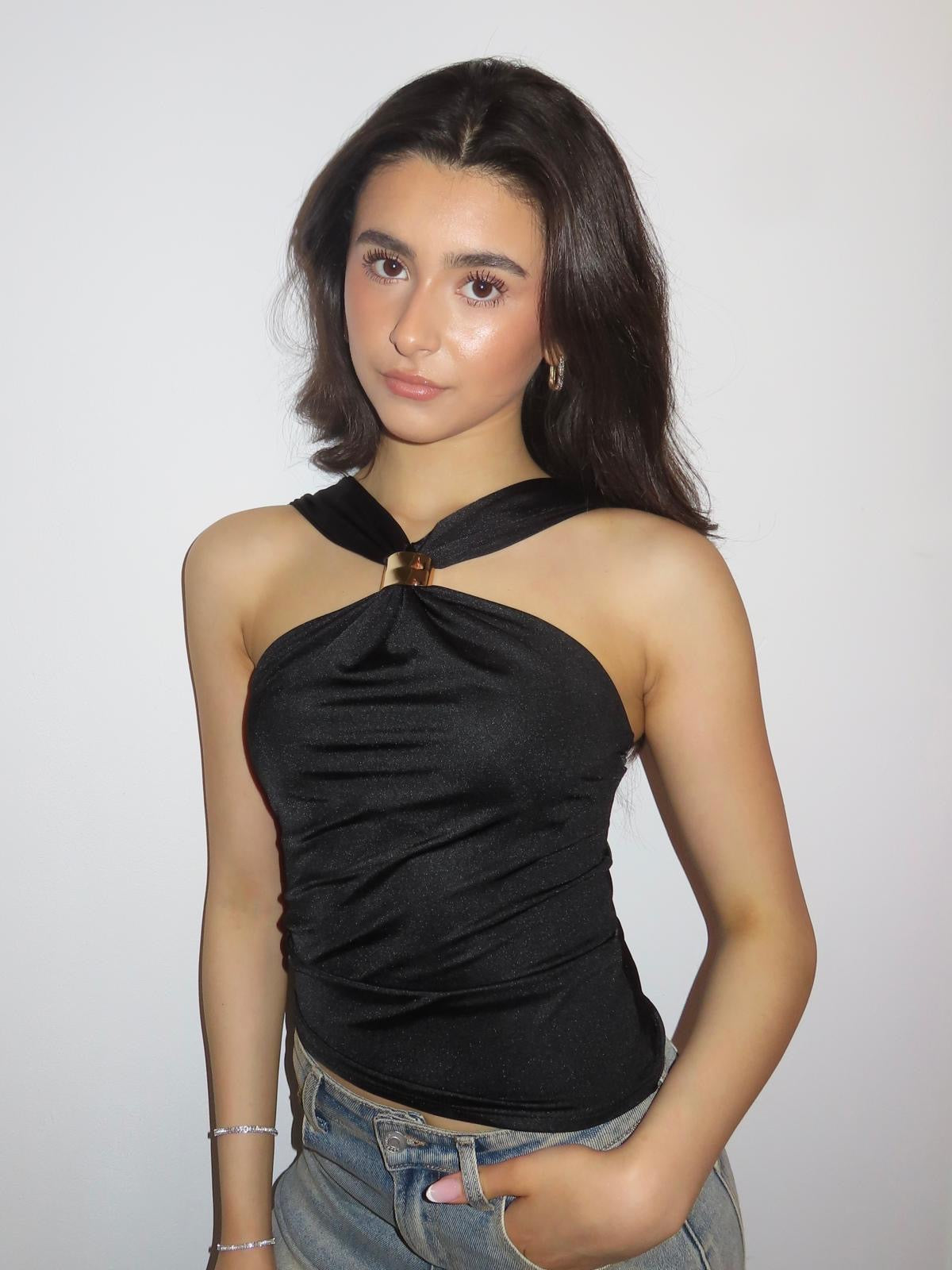 Gorgeous Jasmin top in silky black. It has a beautiful silky sheen and feels incredibly soft. What makes it special is the gold detailing and the strapless design.