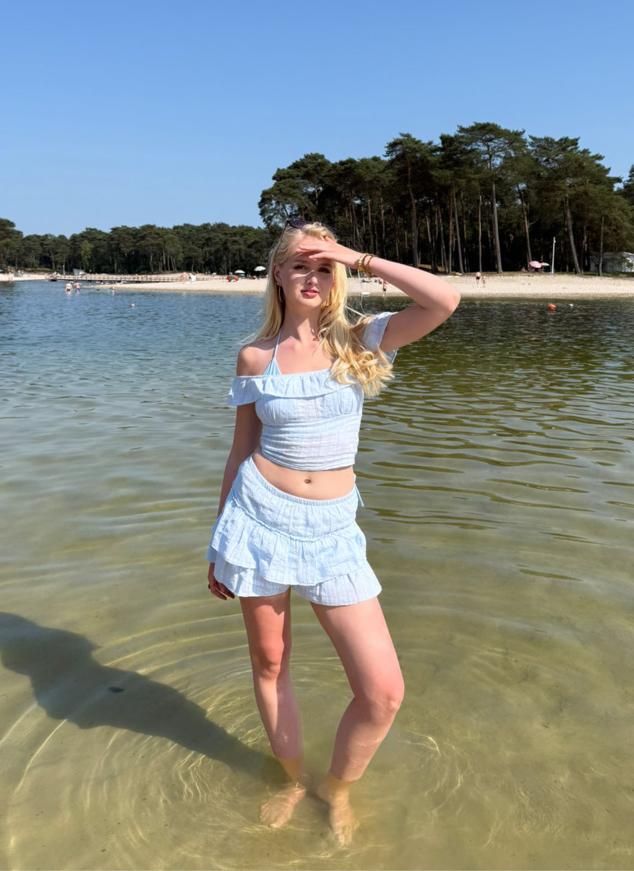 The Azure Kiss skirt in light blue with built-in shorts is airy and so practical! This light blue skirt is the perfect addition to your summer wardrobe. The playful layers give it a feminine flair, while the built-in shorts allow you to move carefree—whether you're cycling, dancing, or walking on the beach.