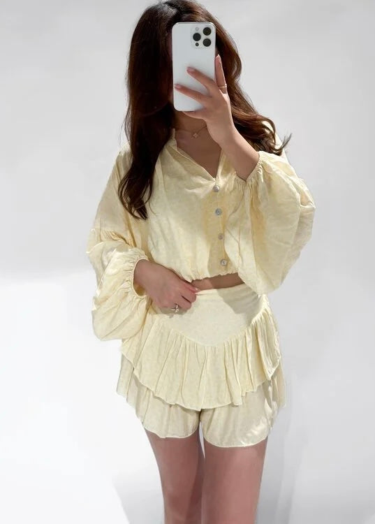 Super cute floral skirt in yellow. This skirt is perfect for vacations and days at the beach. It comes with shorts, which is perfect!