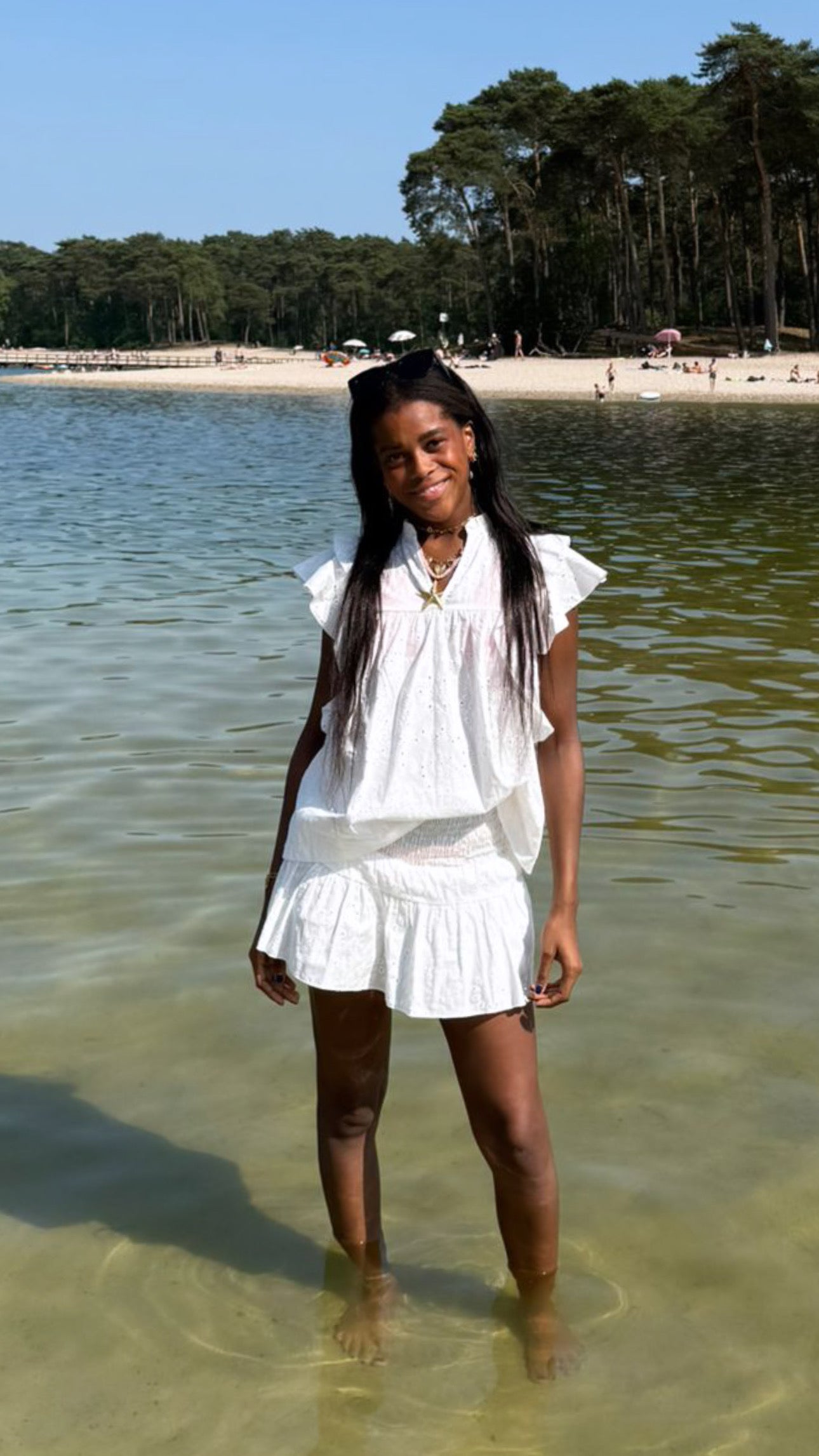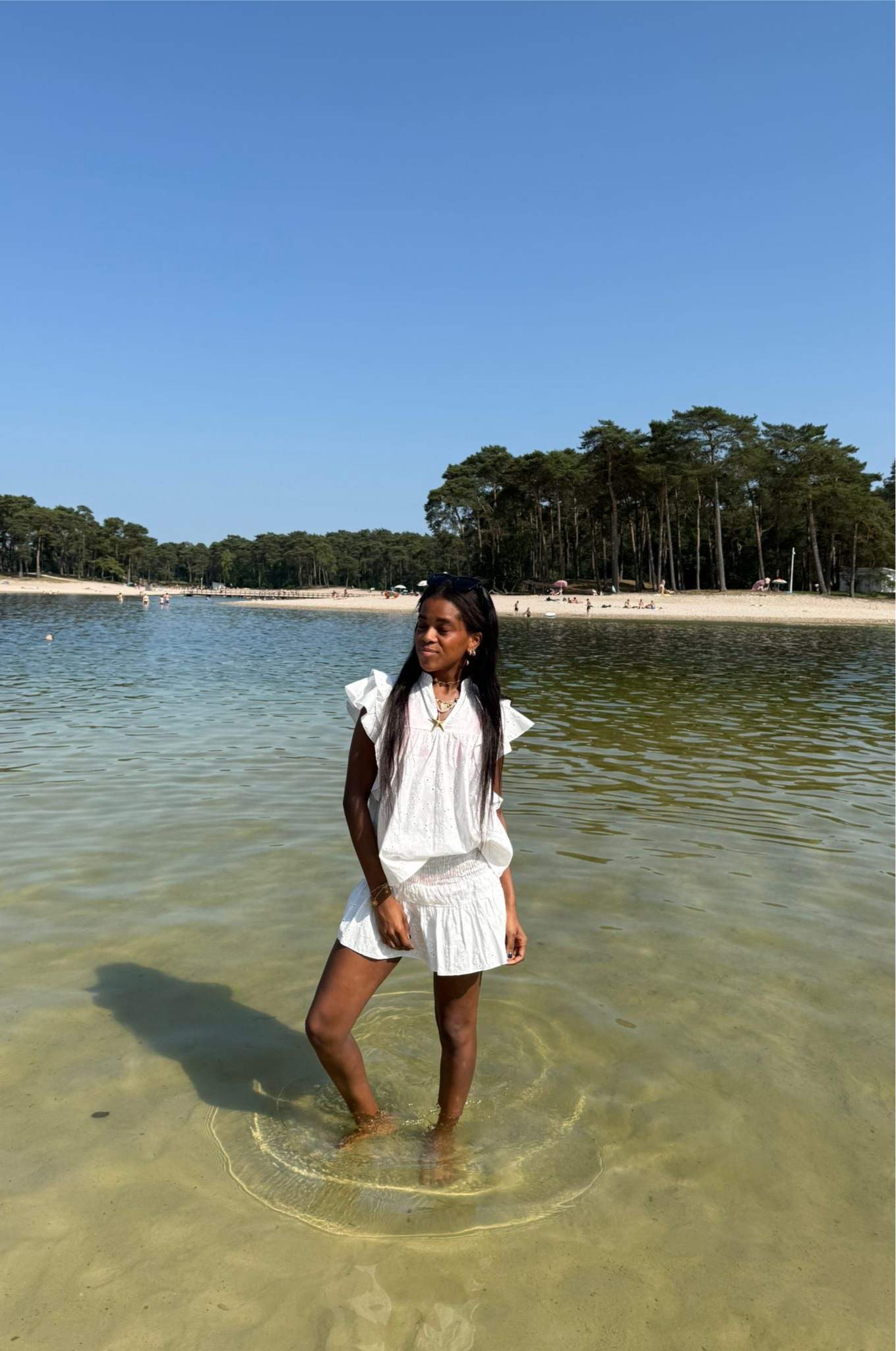Step into summer in style with this white summer ensemble, the perfect combination of comfort and elegance! The airy embroidered top with playful ruffled sleeves gives you a fresh and feminine look, while the matching skirt with integrated shorts ensures ultimate comfort and freedom of movement.