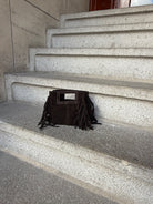 The fringe mini suede bag is the perfect blend of playful and chic. Crafted from dark brown suede leather with subtle stitching and playful fringes on the sides, this bag adds a touch of bohemian luxury to any outfit.