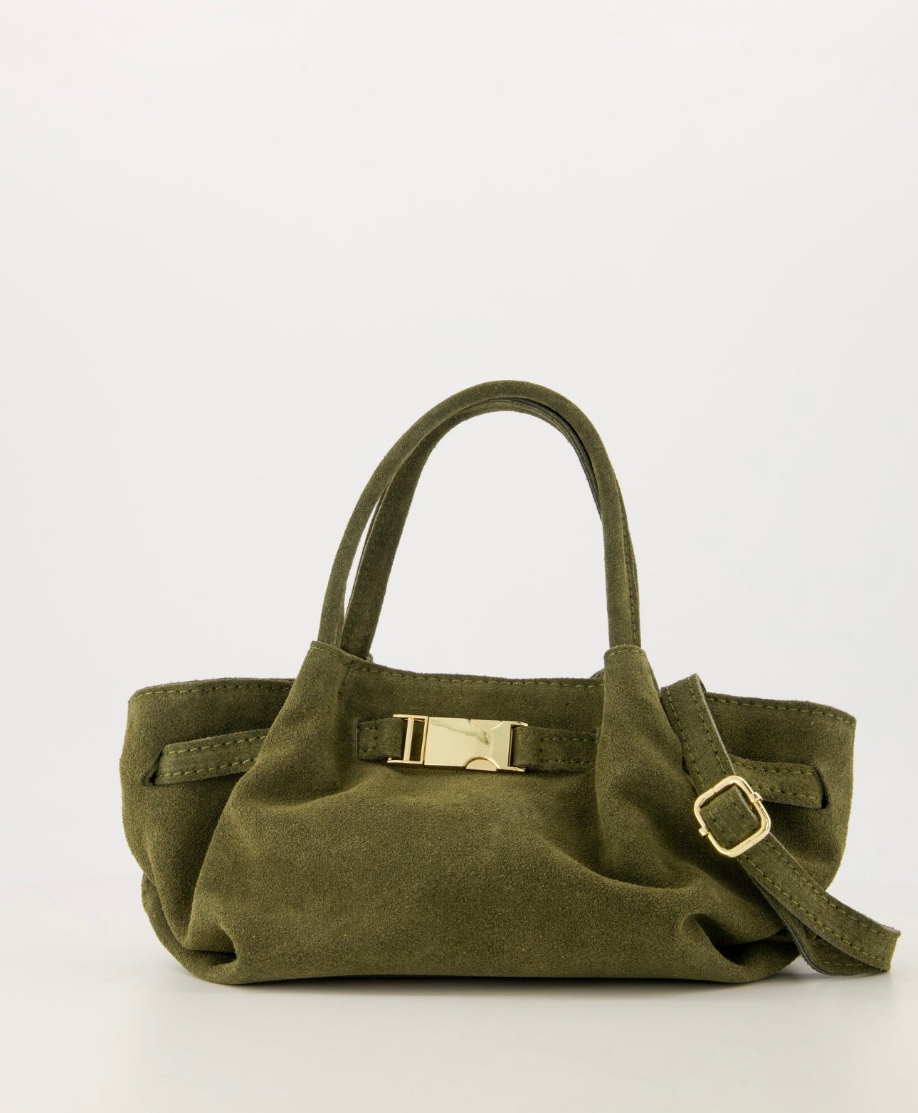 The Saar handbag is a leather handbag made of suede. It can also be worn crossbody. The Saar bag has a detachable and adjustable strap.