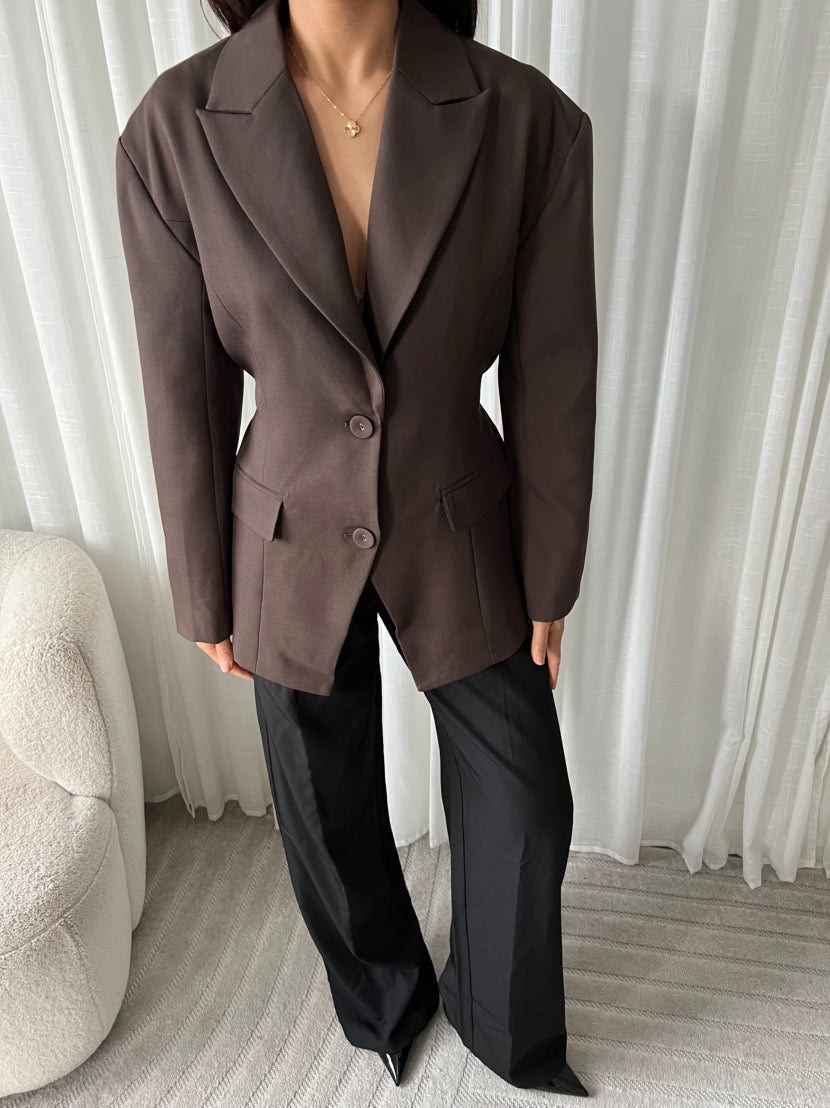 Onze bestseller in warme, rijke bruintint. Deze blazer combineert tijdloze klasse met een moderne, vrouwelijke snit. De verstelbare taille aan de achterkant zorgt voor de perfecte pasvorm, terwijl de sterke schouderlijn en zachte stof structuur én elegantie bieden.