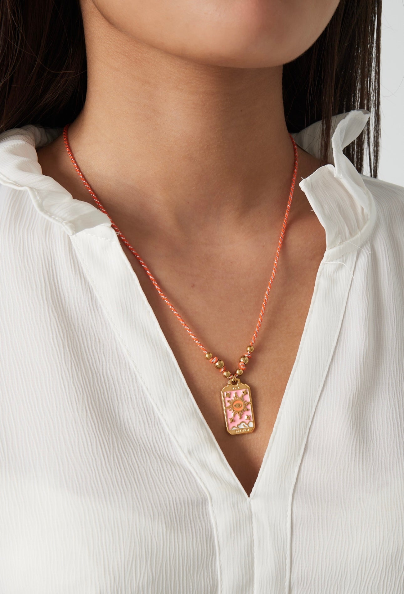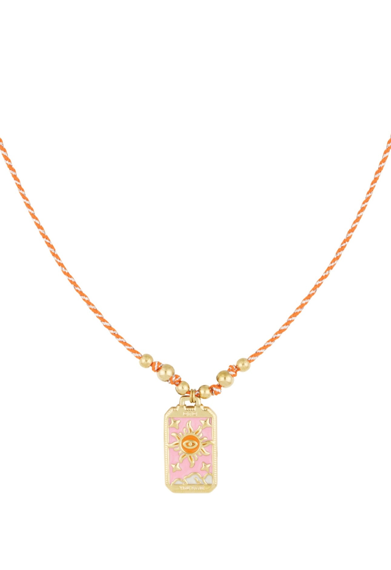 This playful yet sophisticated necklace combines a colorful cord with gold beads and a unique tarot-inspired pendant.