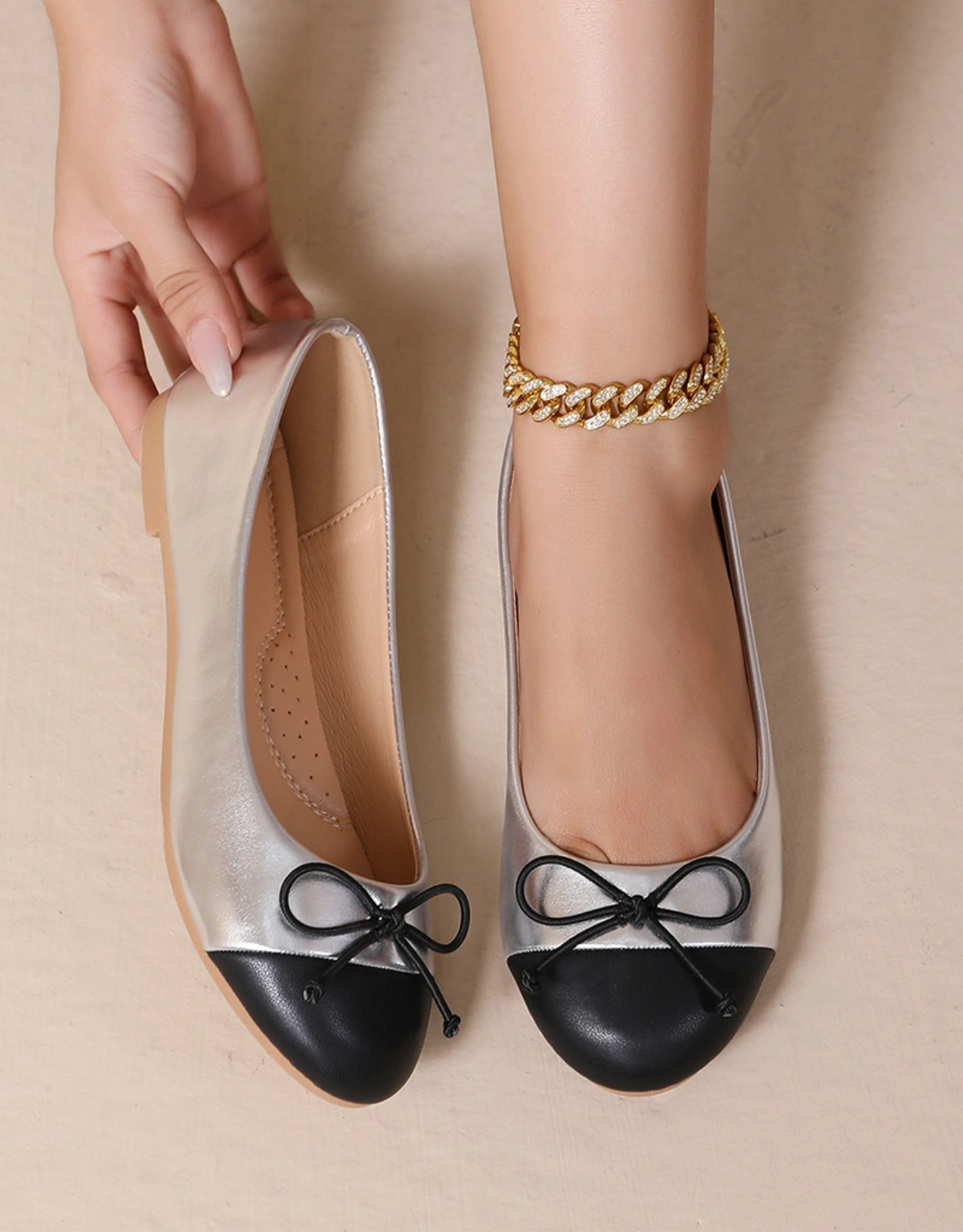 The Silver Bow Ballerina is an elegant and striking shoe that effortlessly combines chic with comfort. The shimmering silver color combined with the black toe and bow creates a timeless yet trendy look. Perfect for any occasion – from casual to classy.