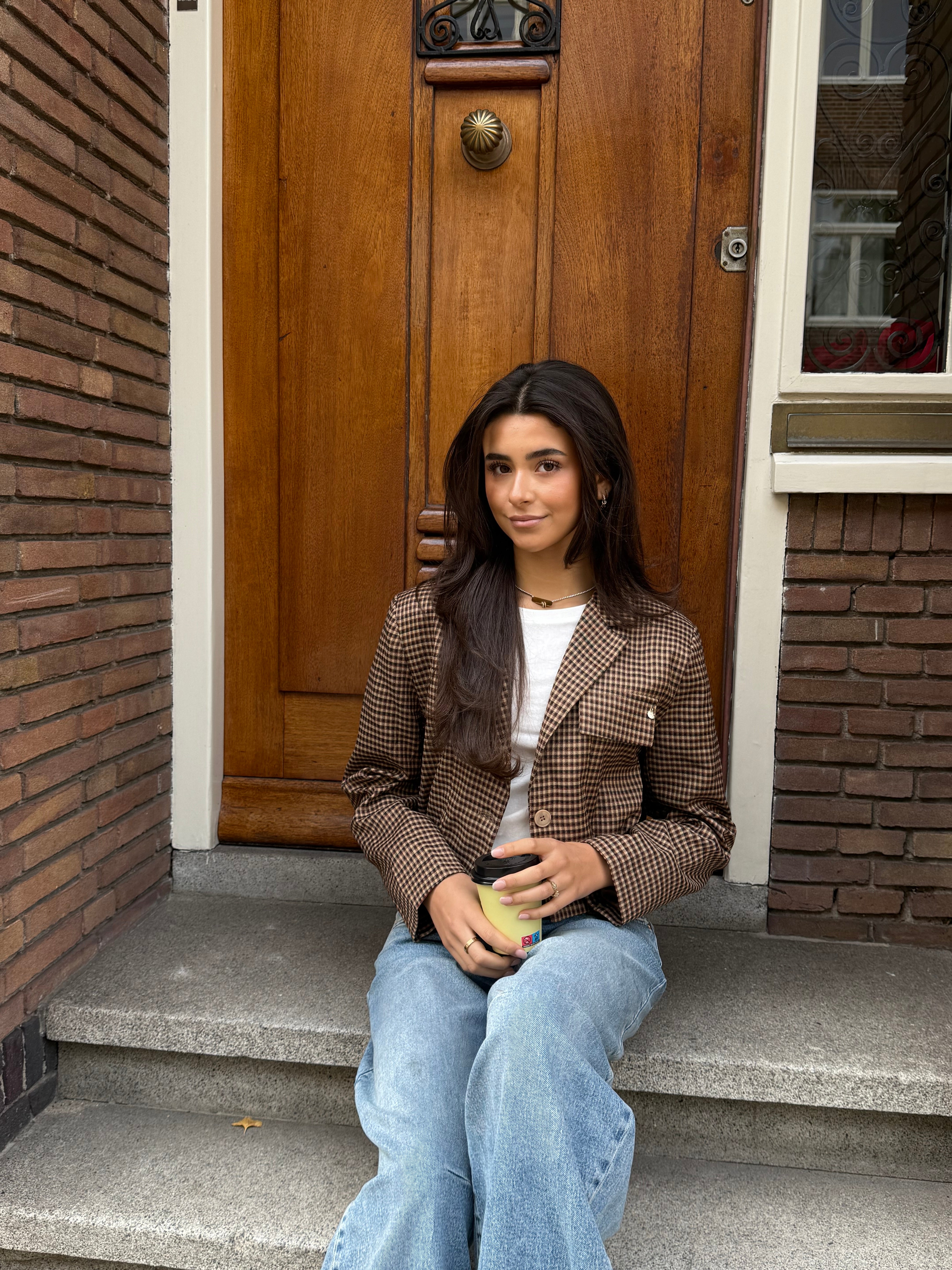 De short & chic variant van de check blazer, nét wat speelser door de cropped fit en warme bruine tint. Het klassieke ruitpatroon geeft een tijdloze uitstraling, terwijl de kortere lengte zorgt voor een moderne, feminine twist. Perfect te combineren met high-waist jeans of een pantalon voor die effortless It-girl look.