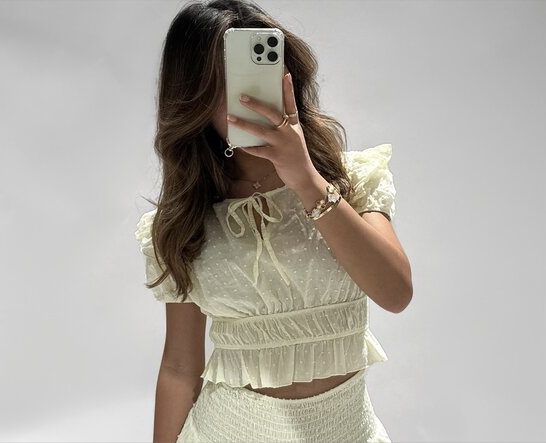 Super cute top in a soft yellow color. It pairs beautifully with a matching skirt in the same color, but also looks great with jeans.