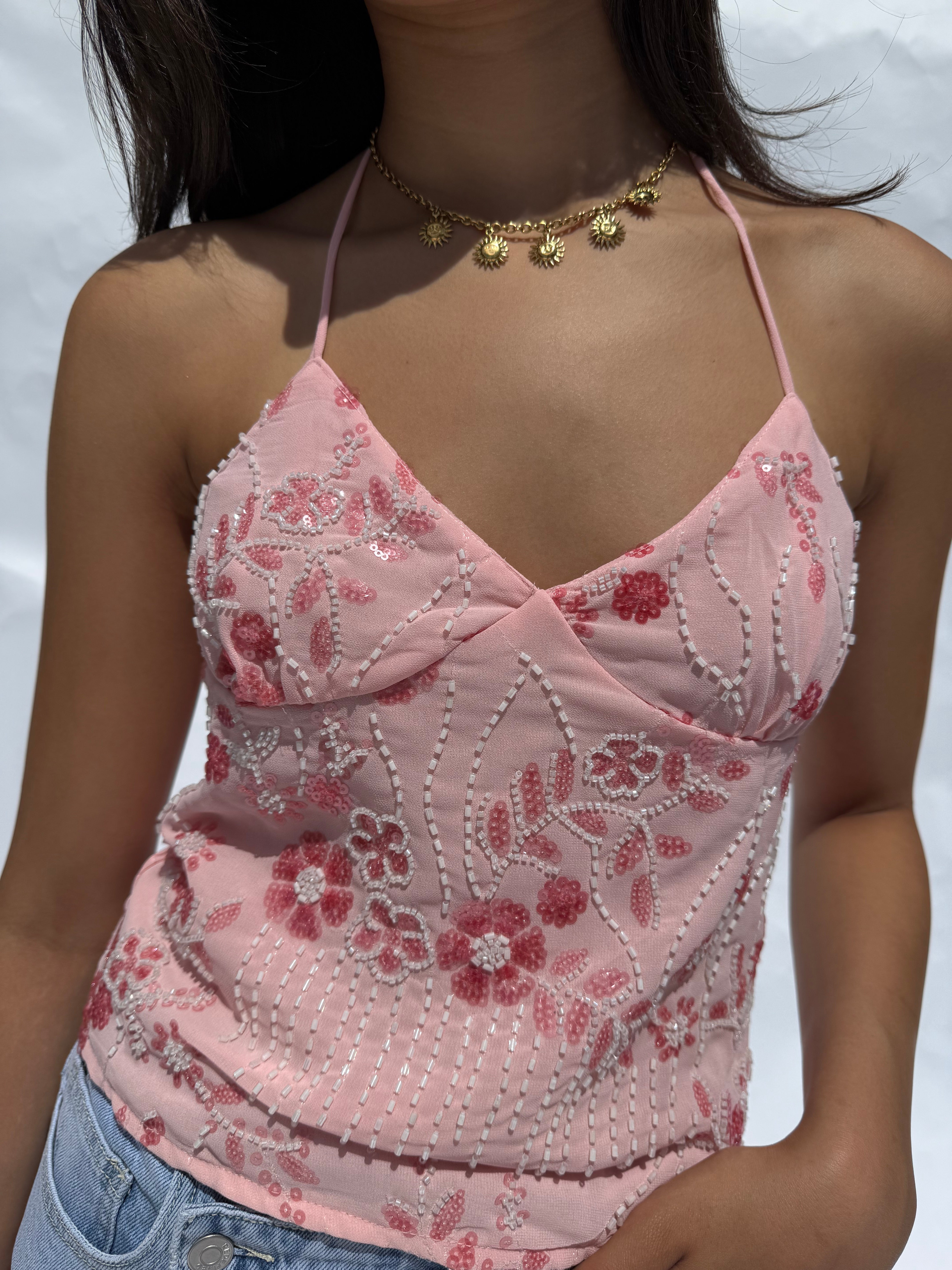 Give your summer wardrobe a romantic twist with this airy halter top featuring embroidered flowers and subtle details. The top features a smocked back for a comfortable fit and adjustable halter straps that you can tie yourself.