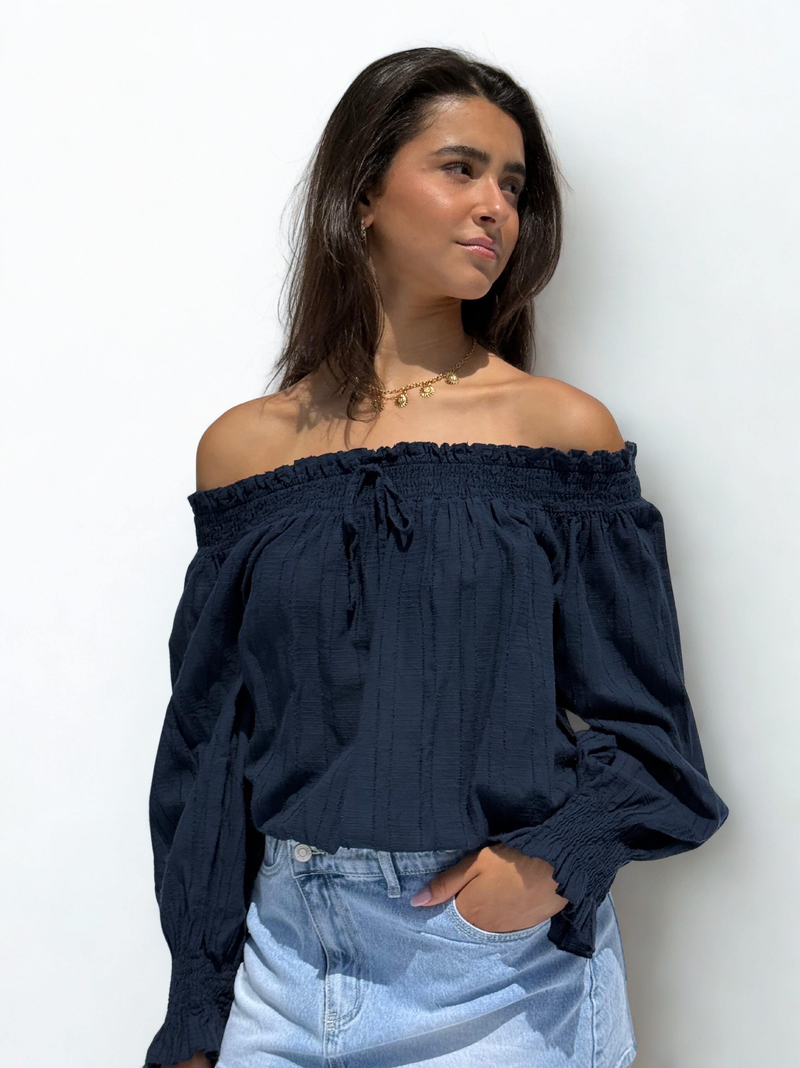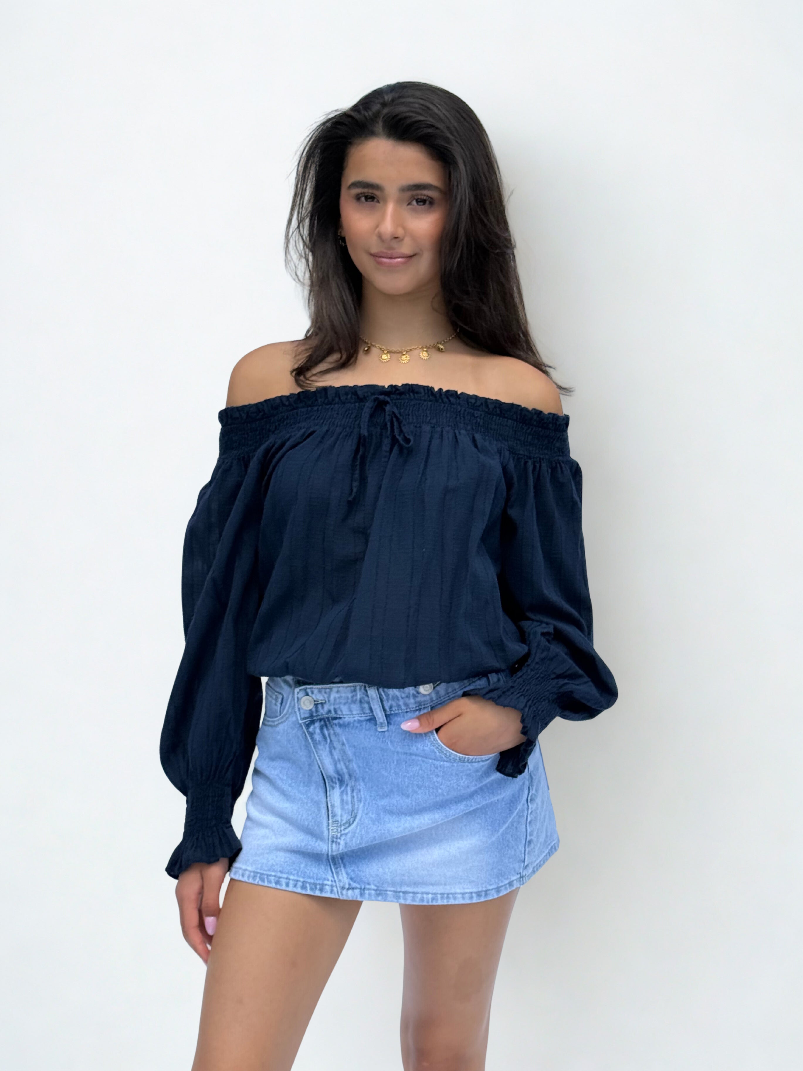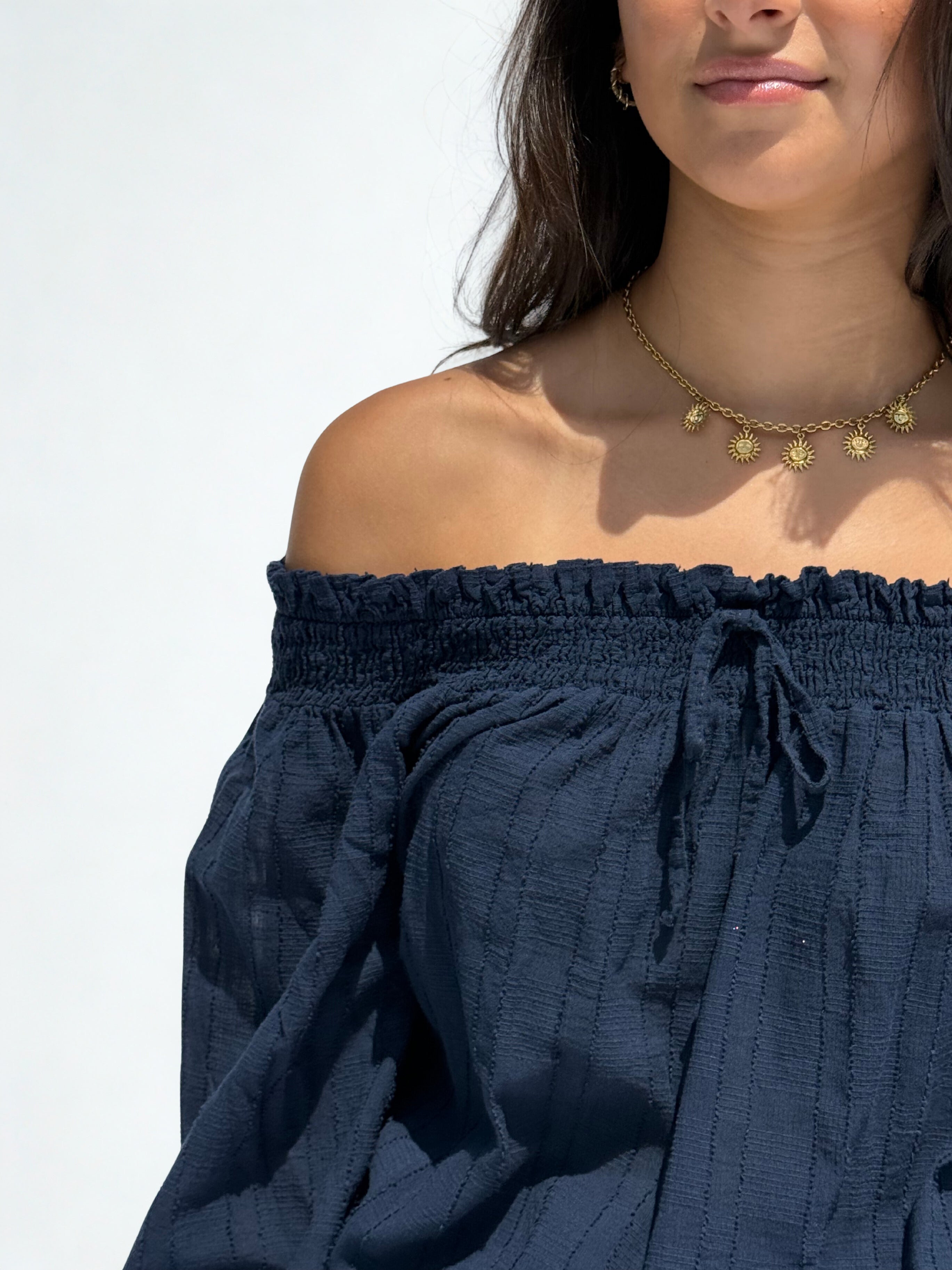 Sunny days call for airy and stylish looks. This navy off-the-shoulder top is just what you need. The flowing fabric and romantic ruffles create a playful, boho vibe, while the elastic neckline creates a feminine, flattering fit. Pair it perfectly with a denim skirt or white trousers for an effortless summer look.