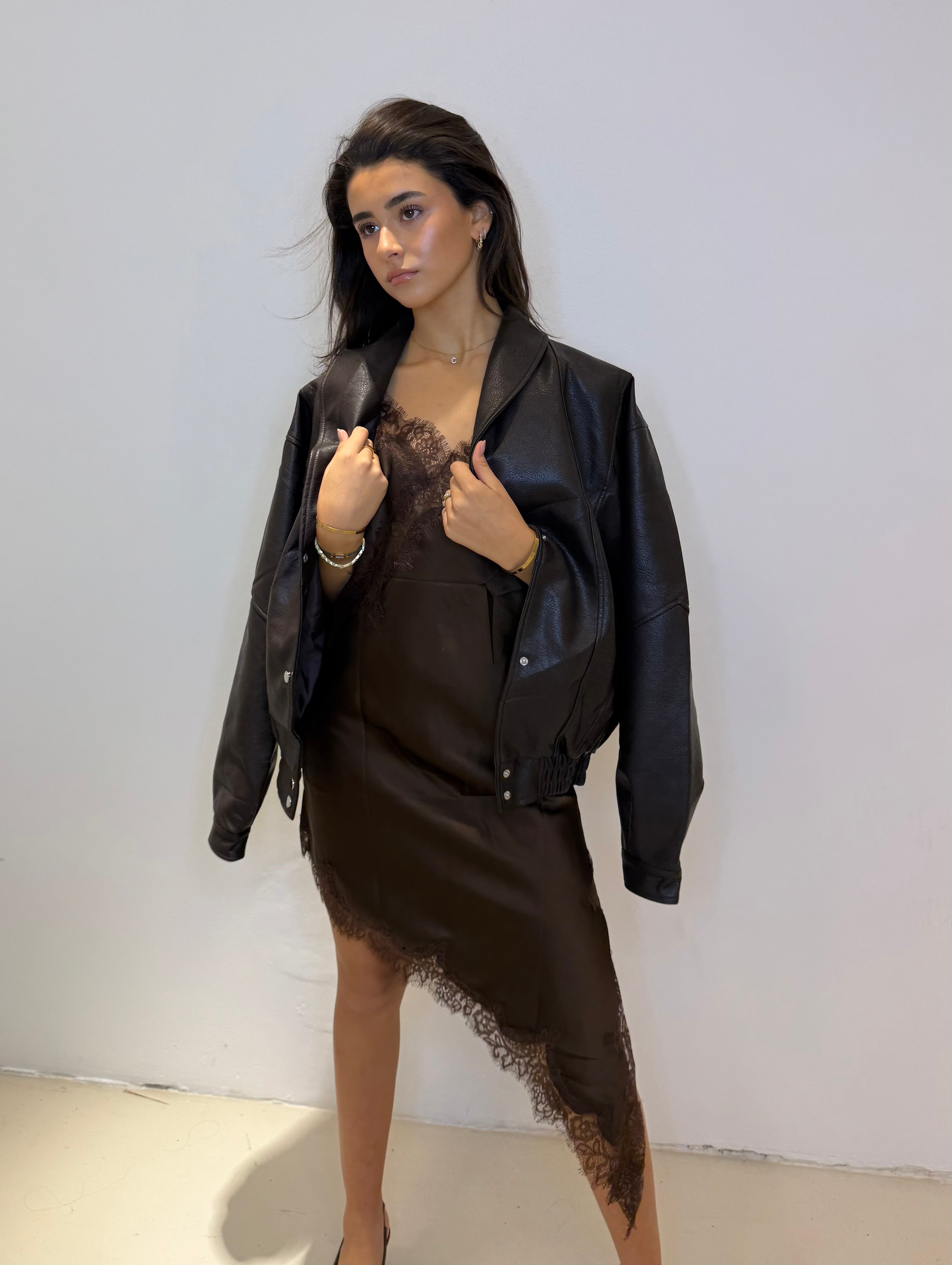 De silky lace dress is een prachtige jurk met een losse fit, elegante kanten details en een schuin lopend design. De silky stof valt soepel en geeft de jurk een luxe uitstraling. Perfect voor een diner of een night out waarbij je effortless chic wilt verschijnen.